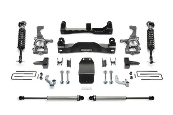 Fabtech's 4'' F150 system utilizes their proven heavy duty construction and design features found in their 6'' systems but with less lift and at a much lower price. This 4'' Systems allows use of 35'' tall tires and features high arched lower control arm crossmembers constructed of 1/4'' thick steel for maximum strength. The Fabtech ductile iron steering knuckles retain the stock track width keeping tires under the fender for a clean appearance. Rear lift is accomplished with a block and u-bolt. The Performance System features Dirt Logic 2.5 Stainless Steel Coilover front shocks and Dirt Logic Stainless Steel 2.25 rear shocks for aggressive offroad capabilities with a smooth highway ride. The 4'' System allows use of 33'' or 35'' tires and is ESC (Electronic Stability Control) and Traction Control compliant. Estimated installation time - 3-4 hrs. 1 hole to drill for installation. No Welding Required. No Driveshaft Modification required.