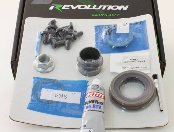 Revolution Gear and Axle's Minimum Install Kits comes with the basic pieces needed to install a new Ring and Pinion gear set. Our Kits include: Pinion seal, Pinion Shims, Carrier Shims, Pinion Nut, Gasket or Sealant, Preload Shims or Crush Sleeve and Ring Gear Bolts in most cases.