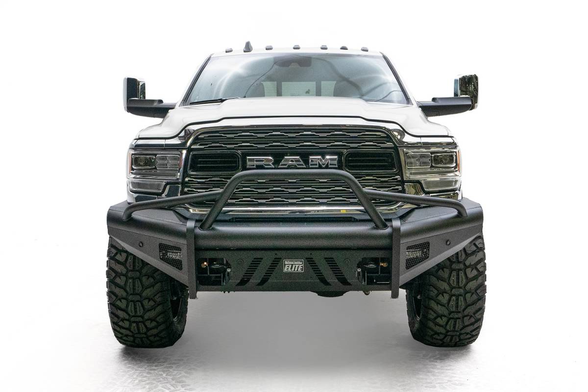 2019 Dodge Ram HD 2500-3500 Combination Pipe and Smooth Plate Construction Sensor Compatible Matte Black Powder Coat Bolt-on tow hooks NOW included Light Mounts for Factory Fog Lights OE Styles ELITE Badge Included Optional Bolt-on Winch Mount (Accepts up to 16,500 lb. w inches or smaller) Optional Bolt-on 1 in. D-ring mounts 100% Made in the USA