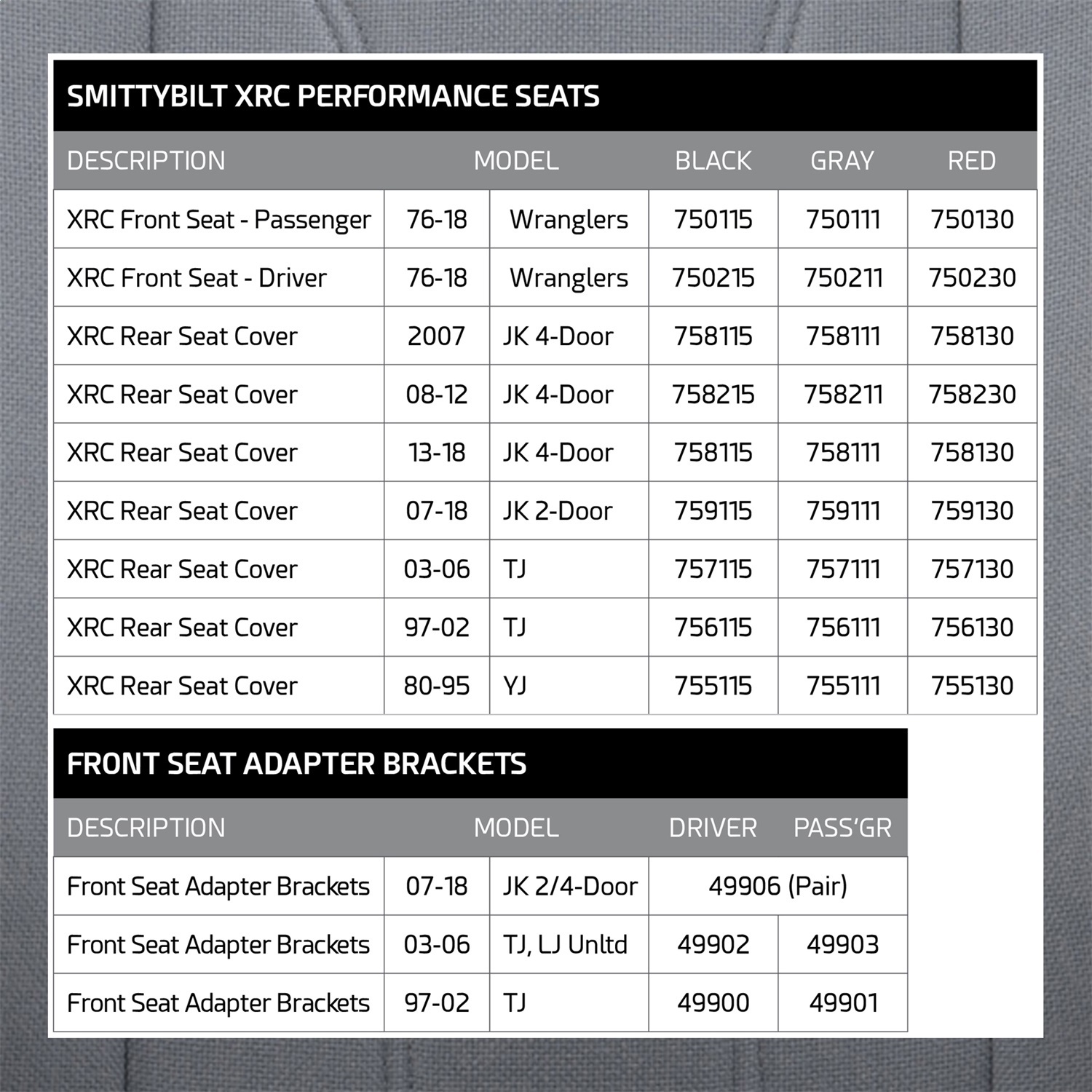 This XRC seat meets the market demands for performance, style and affordability. The XRC seat starts off with a Kodiak frame which is one of the strongest tubular frames in the industry then complimented with high performance foam pack with a contoured single suspension liner, which provides the ultimate in comfort and quality. Heavy duty 9 position recliner, MIL Spec fabrics and accommodates 5- point safety restraints. Works with most 3-point restraint systems and its fully adjustable reclining system and fixed head rest design gives the look and comfort needed for every situation. 1997-02 TJ Wrangler and Unlimited require will require seat bracket adapters sold separately. Sold individually