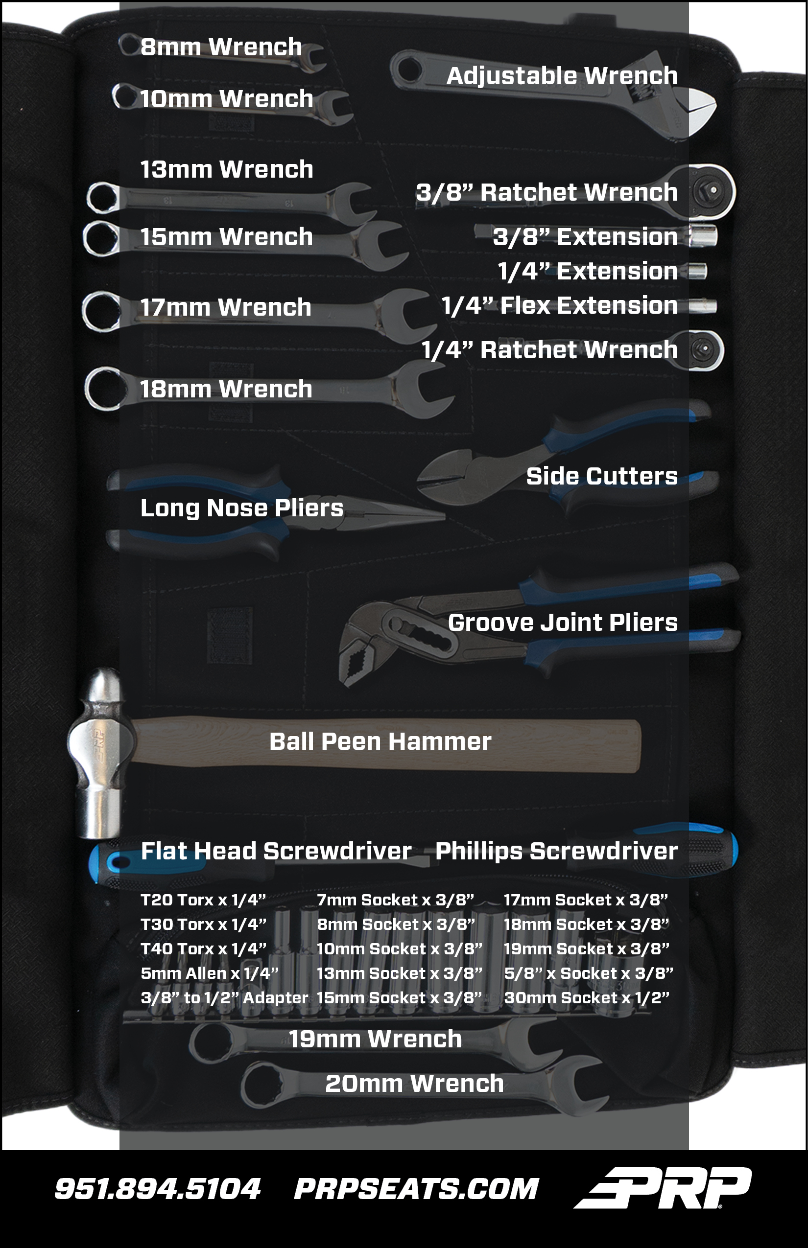 PRP's Can-Am Roll-Up Tool Kit provides everything you need to fix your Can-Am Maverick X3, Sport, or Commander UTV out on the trail. This 35 piece kit includes a selection of high-quality ratchets, sockets, wrenches, extension bars, pliers, and a ball peen hammer (for when things get really fun). We've hand picked the tools that are needed most when working on a Can-Am - So you have only the essentials that you really need. Below we have listed all the tools included, along with a handy guide to the most common uses for each tool. Each tool also includes a Limited Lifetime Warranty.