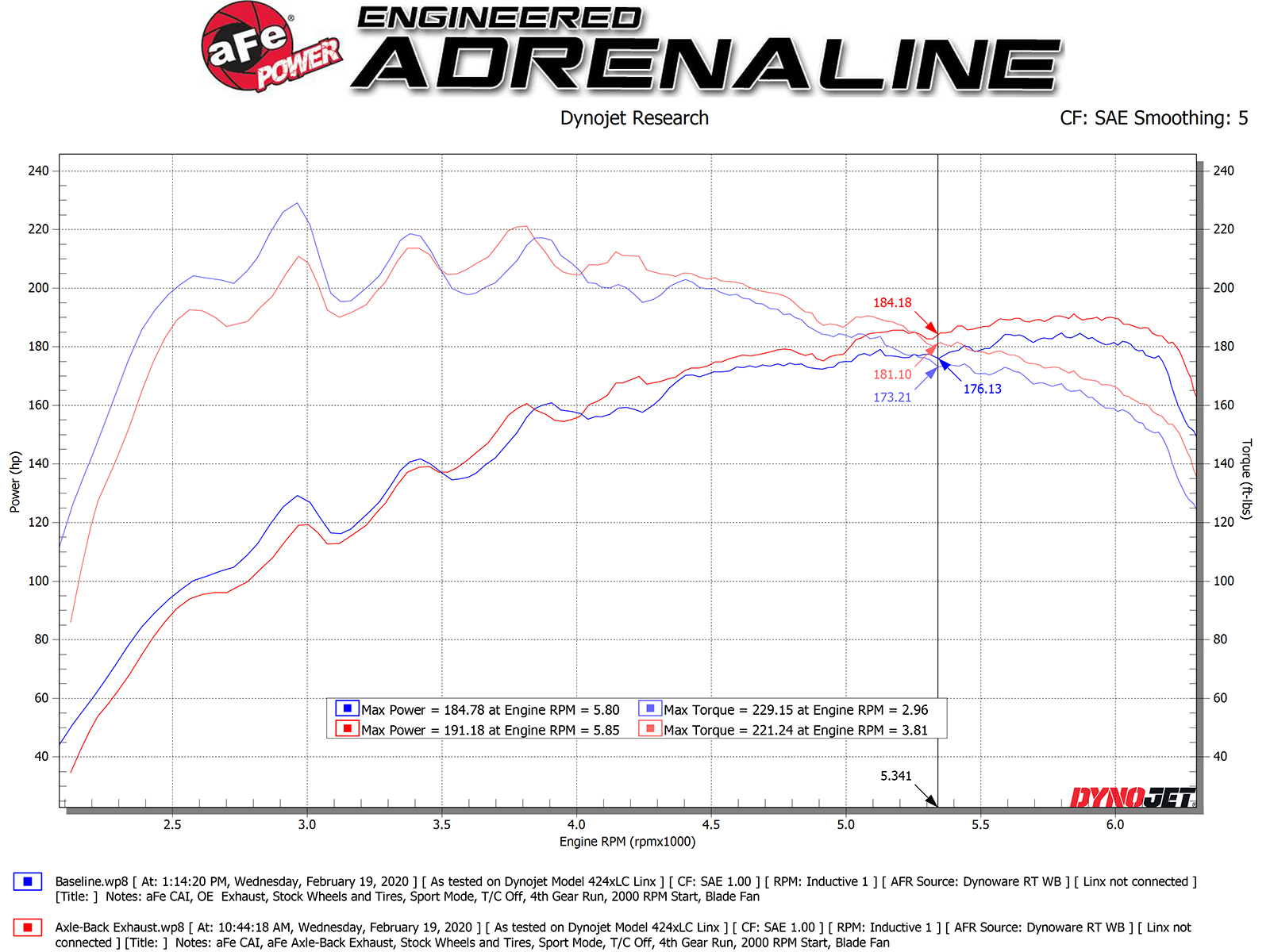Performance Gains: This system produced gains of up to +8 HP and +8 lbs. x Ft. TQ., as measured on our in-house dyno. 3" - 2-1/2" 304 Stainless Steel Construction: This axle-back exhaust system is constructed of 3" - 2-1/2" mandrel-bent 304 stainless steel tubing for maximum strength and durability. Dual 4-1/2" Diameter Polished Exhaust Tips: Finishing off this exhaust system are dual 4-1/2" diameter polished 304 stainless steel clamp-on exhaust tips. The tips feature a laser etched Takeda logo for a unique style. Throaty Sound: This system produces a throaty sound unleashing all available horsepower and torque. Installation: Utilizing a factory style flange and hangers this system is a direct bolt-on system, which requires no cutting or modifications for a hassle-free installation. Integrated Mitered Merge Collector: A mitered merge collector is used to decrease turbulence and increase exhaust velocity resulting in increased horsepower, torque and improved throttle response. Computer-Aided Design: Utilizing state-of-the-art computer-aided design technology, this exhaust system is designed for custom, high tolerance factory fitment. MIG-Welded: 100% MIG-Welded for race-proven strength and durability. Emissions Disclaimer: This product does not require a CARB EO#. aFe POWER exhaust systems are engineered and manufactured in our Corona, California facility.