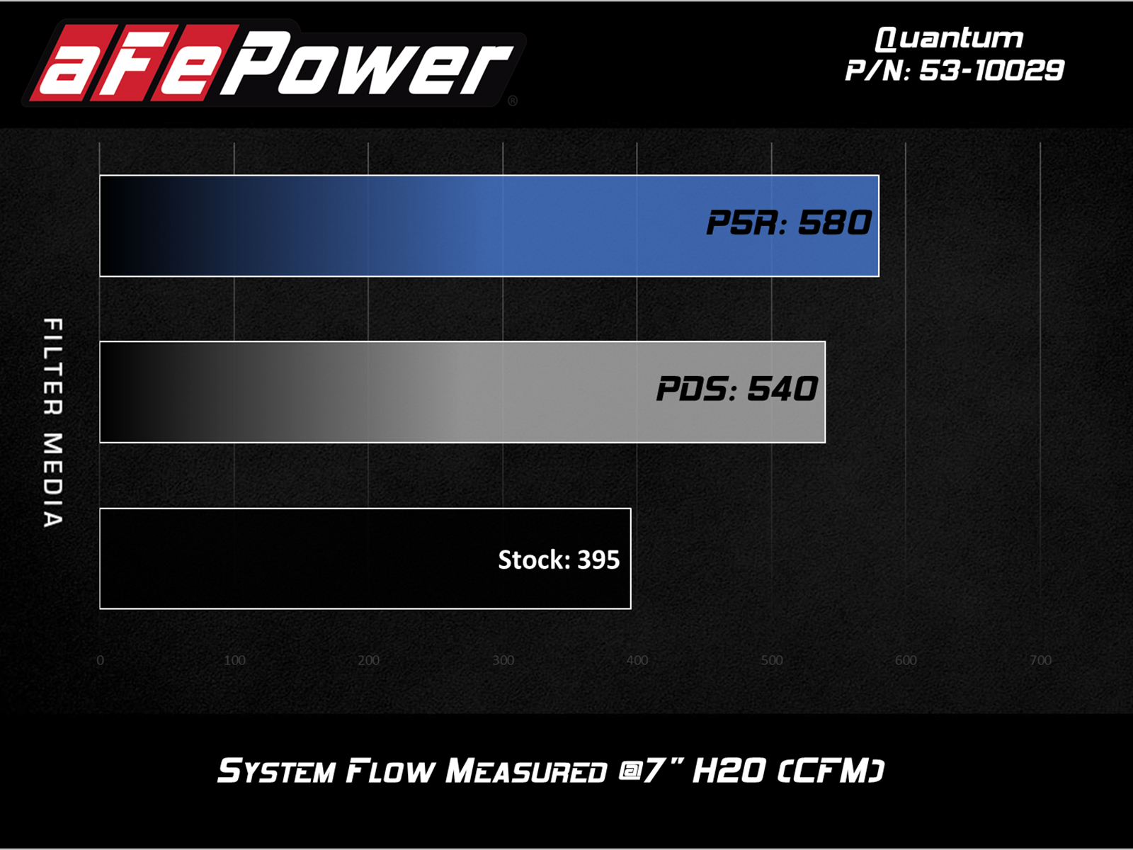 This 360-degree radial flow air filter features a 5" flange and our oil-free Pro DRY S media with three layers of synthetic media for maximum convenience. Its progressive layering provides great filtration efficiency and dust holding capacity, while not requiring the use of oils. This media is best suited for street and light off-road use. The filter features an injection molded base and top for lighter weight and rigidity. Its base includes a built-in 3-angle velocity stack for smooth, even airflow and captive screws to easily attach the filter to the housing. Quantum uses an integrated filter-to-housing design that attaches both components with four captive screws, making for a positive surface area seal, as well as easy installation and maintenance. Its durable sealed housing features a unique, five rib, industrial-grade look for aFe quality recognition. Quantum uses a dyno-tuned, computer designed intake tube to achieve optimum air flow and a perfect fit. Its XLPE (cross-linked polyethylene) polymer material is heat soak resistant and extremely durable. This Quantum intake system includes a flexible bellows-style coupling and a durable reinforced silicone coupling. Quantum intakes are designed with fewer parts for a quick and easy installation. This is a direct fit intake system that utilizes factory mounting points and requires no cutting or modifications. All necessary clamps, couplings, and hardware are included.