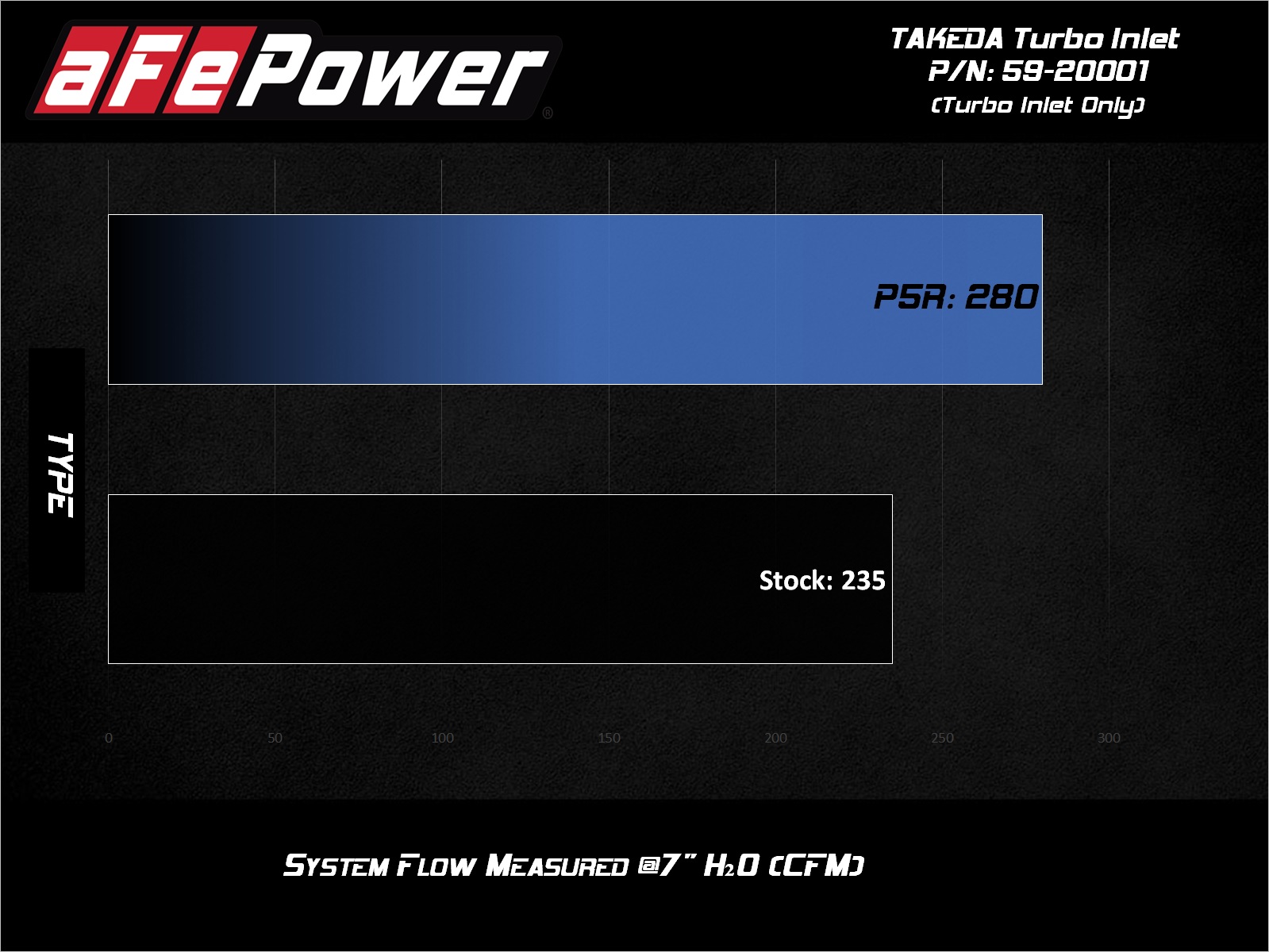 This turbo inlet removes the air flow restriction of the factory turbo inlet and guarantees the maximum air flow to the turbo for maximum power. It provides a smooth transition for the air from the factory air intake tube to the turbo with the minimum restriction. Precisely CNC machined out of 6061-T6 billet aluminum, the adapter mounts directly onto the turbo and guides the increased air flow from the Takeda intake into the turbo. . It is black anodized for durability and a stealthy appearance. This turbo inlet utilizes a flexible silicone coupling that is reinforced with three layers of polyester material, making it resistant to wear and deterioration. The silicone coupling mates directly to the aluminum turbo adapter and the factory air intake tube. All necessary clamps are provided. All necessary clamps and hardware are provided for a fast and easy installation. The factory harness bracket mounts directly onto the aluminum adapter for perfect fitment. This item will only fit with the factory air intake system. It will NOT fit with Takeda air intake systems P/N: 56-10021D, 56-10021R, 56-70021D and 56-70021R. For use with Takeda air intake system, see part number 59-20002.