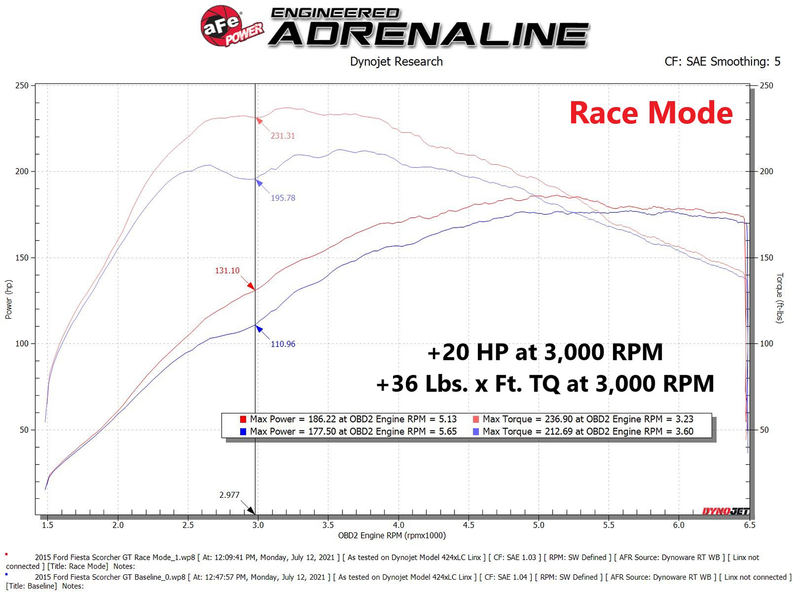 - Dyno tested and produced significant power increases of +20 HP / +36 lbs. x ft. torque in race mode at 4,000 RPM