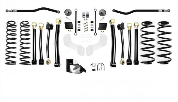 Stage 1 kits includes all the necessary parts to lift your JL 4.5 inchs. Stage 2 kits includes Stage 1 components as well as EVO MFG Enforcer JL Front Lower Adjustable Control Arms to allow for caster adjustments.