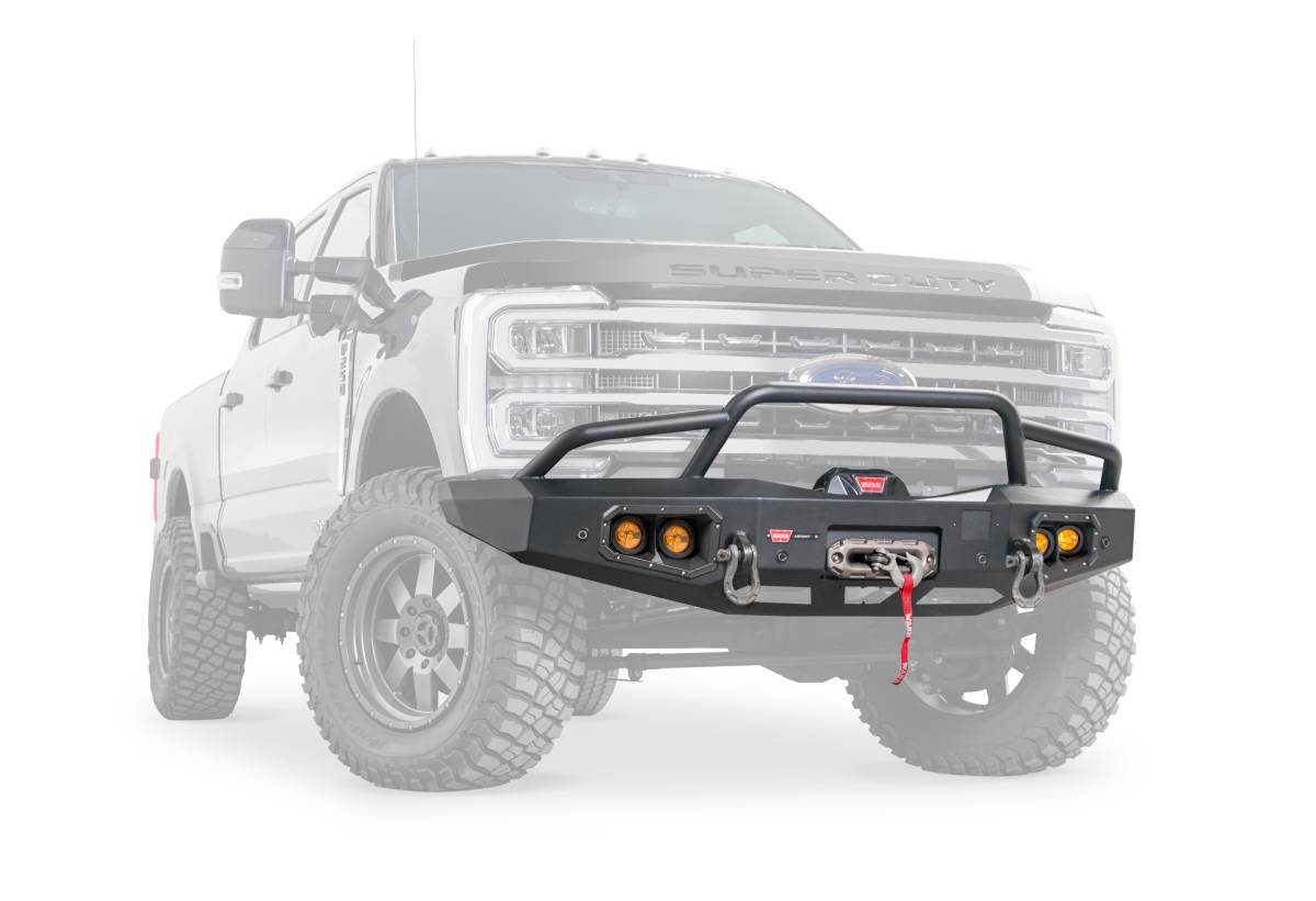 Ascent Front Bumper for Ford Super Duty with prerunner grille guard featuring an integral winch mount for WARN mid-frame winches
