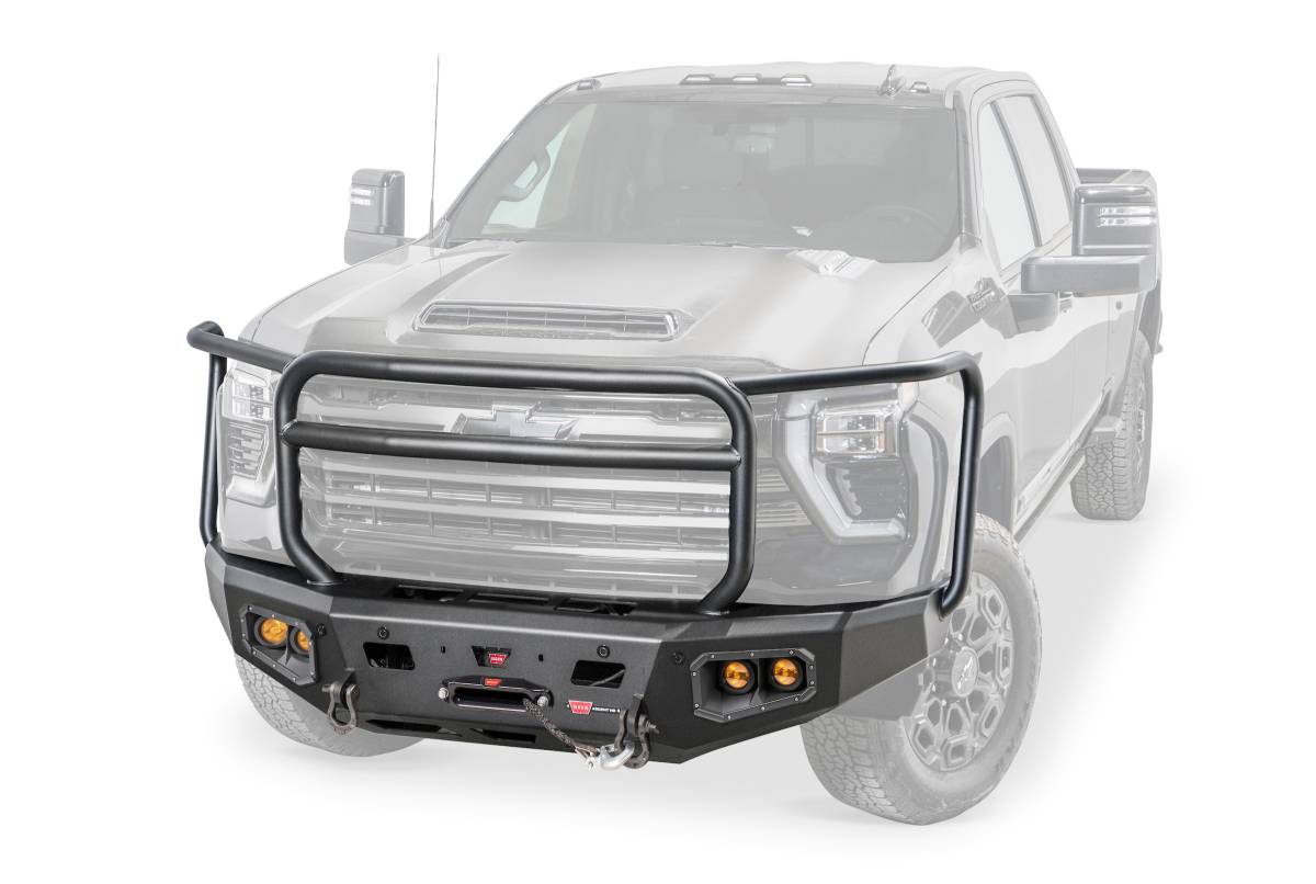 WARN Ascent HD front bumper for Chevrolet Silverado 2500HD and 3500HD featuring a pre-runner style grille guard and integrated winch mount that will accept large or mid-frame winches up to 18,000 lbs in capacity.