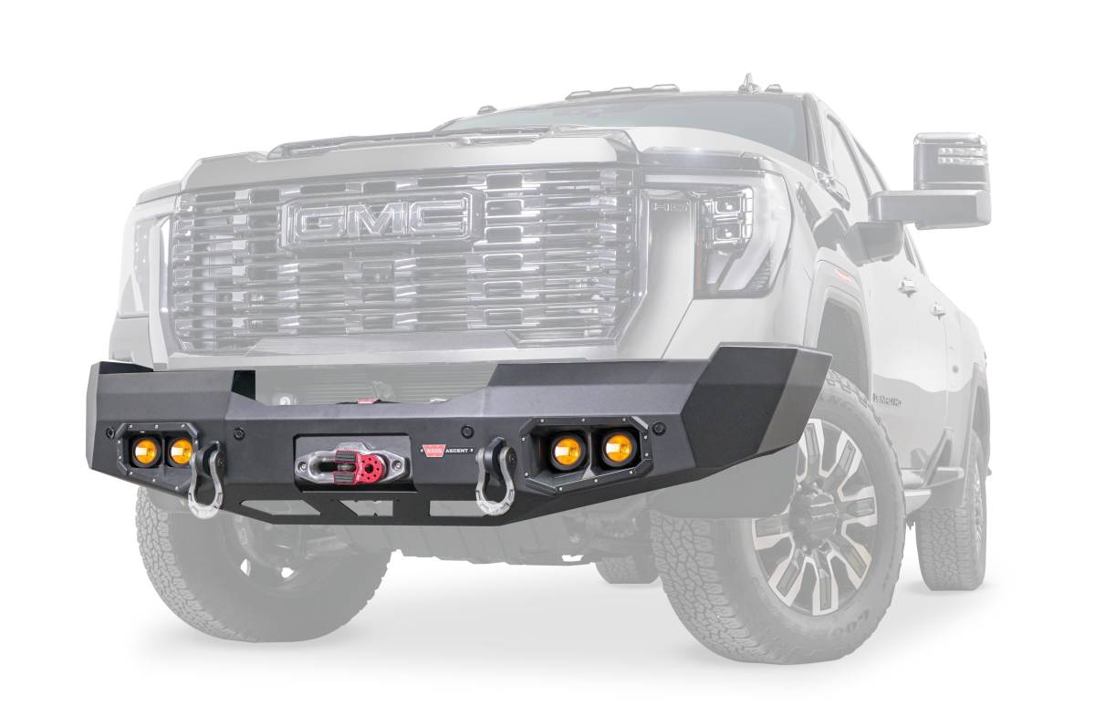 Ascent Front Bumper for GMC Sierra 2500HD and 3500HD featuring an integral winch mount for WARN mid-frame winches