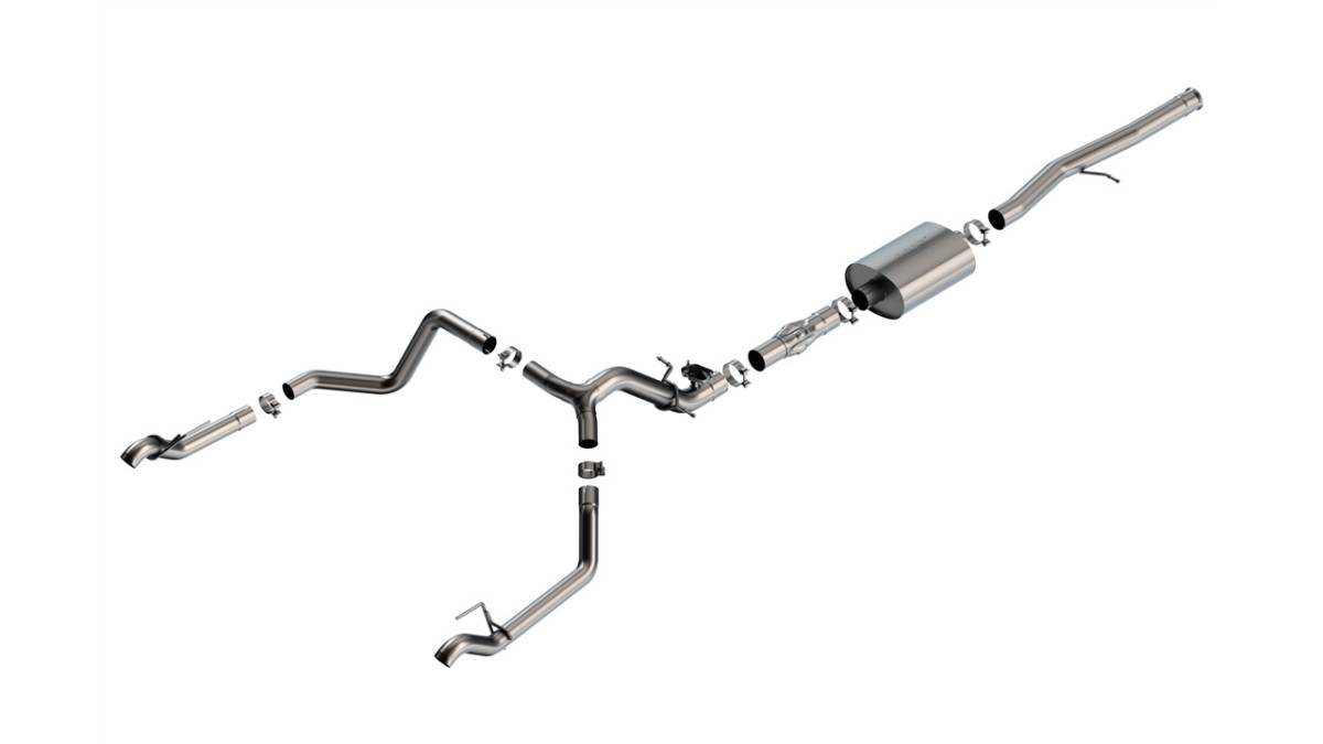 - EXCEPT ZR2 & AT4X models. Factory Split Rear Exit Vehicles ONLY. Add Adapter 60706 for Crew Cab with Standard Bed (6' 7") 157" Wheelbase vehicles. This Borla(r) system has a valve simulator to prevent the Check Engine Light from coming on. The 3.5" diameter into dual 2.75" system features Borla(r)'s aggressive ATAK(r) muffler and Polyphonic Harmonizer Technology which utilizes patented units that contain pipes of different diameters and lengths to create multiple exhaust notes that harmonize to deliver a clean, rich, full-bodied sound with no drone inside the vehicle. Replace the Polyphonic Harmonizer behind the muffler in this ATAK(r) system with muffler 60679 to attain the S-Type sound level (quieter than ATAK(r)). Tips NOT Included, reuse factory tips. Systems that include tips are also available. Borla(r) Cat-Back(tm) & Axle-Back exhaust systems feature patented straight-through and multi-core technology to unleash hidden horsepower. Increased exhaust velocity adds power, driving excitement, fuel economy, and the distinctive Borla(r) Sound of Power respected by motoring enthusiasts everywhere. Each system is built from premium T-304 austenitic stainless steel, superior to T-400 series knockoffs (such as 409), to give you the absolute best in performance and durability. Ultra-smooth mandrel bends ensure maximum flow & power, and precision computer numerical control (CNC) manufacturing ensures an accurate fit. Give your Silverado or Sierra the power and sound it deserves, bolt on a Borla(r) Best of all, Borla(r) stands behind every system with a Million-Mile Warranty. Just what you'd expect from the world's most experienced (and most winning) exhaust brand.