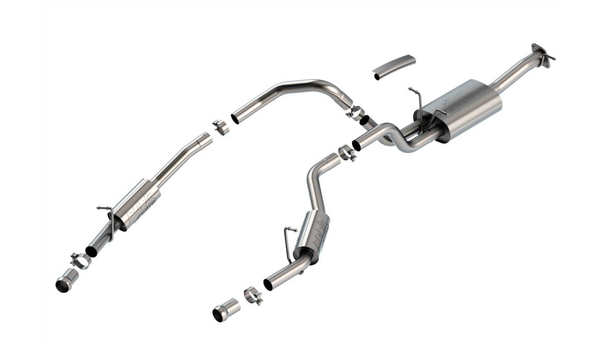 - EXCEPT High Output & GT Package. This 3" diameter into dual 2.5" Cat-Back™ system contains BORLA®'S Polyphonic Harmonizer Technology inside the muffler that utilizes patented units that contain pipes of different diameters and lengths to create multiple exhaust notes that harmonize to deliver a clean, rich, full-bodied sound. The system delivers the aggressive ATAK® sound with no drone inside the vehicle. Tips NOT included, use optional BORLA® tips or reuse Original Equipment (O.E.) tips. BORLA® Cat-Back™ and Axle-Back exhaust systems feature patented straight-through and multi-core technology designed to unleash hidden horsepower. Increased exhaust velocity adds power, driving excitement, fuel economy, and the distinctive BORLA® Sound of Power respected by motoring enthusiasts everywhere. Each system is built from premium high-quality T-304 austenitic stainless steel, superior to T-400 series knockoffs (such as 409), to give you the absolute best in performance and durability. Ultra-smooth mandrel bends ensure maximum flow & power, and precision computer numerical control (CNC) manufacturing ensures an accurate fit. Best of all, BORLA® stands behind every system with a Million-Mile Warranty. Just what you'd expect from the world's most experienced (and most winning) exhaust brand.