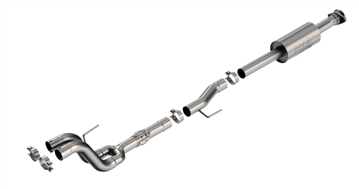 - NOT Compatible with the 3.5L PowerBoost. Fits Models With Bumper Cutouts (Notches). For models WITHOUT bumper cutouts, use one of our standard Cat-Back systems like 140867. This Mid-Section / Muffler Assembly features 3" diameter pipes and the aggressive ATAK(r) sound with no drone inside the vehicle. It fits with either BORLA(r) tail pipes 60640, 60640BC, or 60640CFBA, or the Original Equipment (O.E.) tail pipes. It features our Polyphonic Harmonizer technology that utilizes patented units that contain pipes of different diameters and lengths to create multiple exhaust notes that harmonize to deliver a clean, rich, full-bodied sound. BORLA(r) Cat-Back(tm) & Axle-Back exhaust systems feature patented straight-through and multi-core technology to unleash hidden horsepower. Increased exhaust velocity adds power, driving excitement, fuel economy, and the distinctive BORLA(r) Sound of Power respected by motoring enthusiasts everywhere. Built from premium T-304 stainless steel, superior to T-400 series (such as 409), to give you the absolute best in performance and durability. Ultra-smooth mandrel bends ensure maximum flow & power, and precision computer numerical control (CNC) manufacturing ensures an accurate fit. Best of all, BORLA(r) stands behind every Mid-Section with a Million-Mile Warranty. Just what you'd expect from the world's most experienced (and most winning) exhaust brand.
