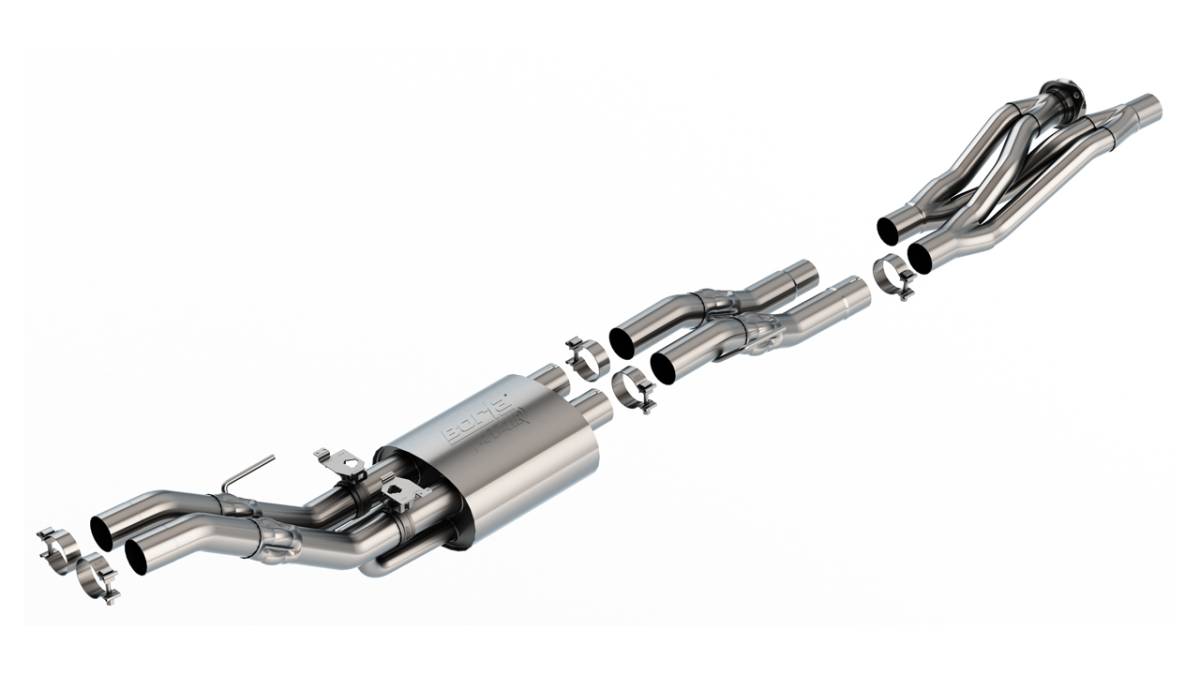 - Borla(r) system is a True Dual design. This 3" diameter Mid-Section includes Active Exhaust Valves. The ATAK(r) sound level delivers an aggressive, race-bred sound without any drone. It features our Polyphonic Harmonizer and SwitchFire(r) technology. Borla(r)'s Polyphonic Harmonizer Technology utilizes patented units that contain pipes of different diameters and lengths to create multiple exhaust notes that harmonize to deliver a clean, rich, full-bodied sound. Completely eliminating the turbulent center intersection of a standard X-Pipe, Borla(r)'s patented SwitchFire(r) design truly blends the combustion pulses from both sides of the engine for improved performance and a custom sound. It fits with either Borla(r) 60727BC black chrome on T-304 stainless steel, 60727CB brawler style black coated T-304 stainless steel, 60727CFBA carbon fiber with black anodized center, or the Original Equipment (O.E.) tail pipes. The system is constructed using T-304 stainless steel, superior to T-400 series knockoffs (such as 409), to give you the absolute best in performance and durability. Ultra-smooth mandrel bends ensure maximum flow & power, and precision computer numerical control (CNC) manufacturing ensures an accurate fit. Best of all, it is backed by our Million Mile Warranty.