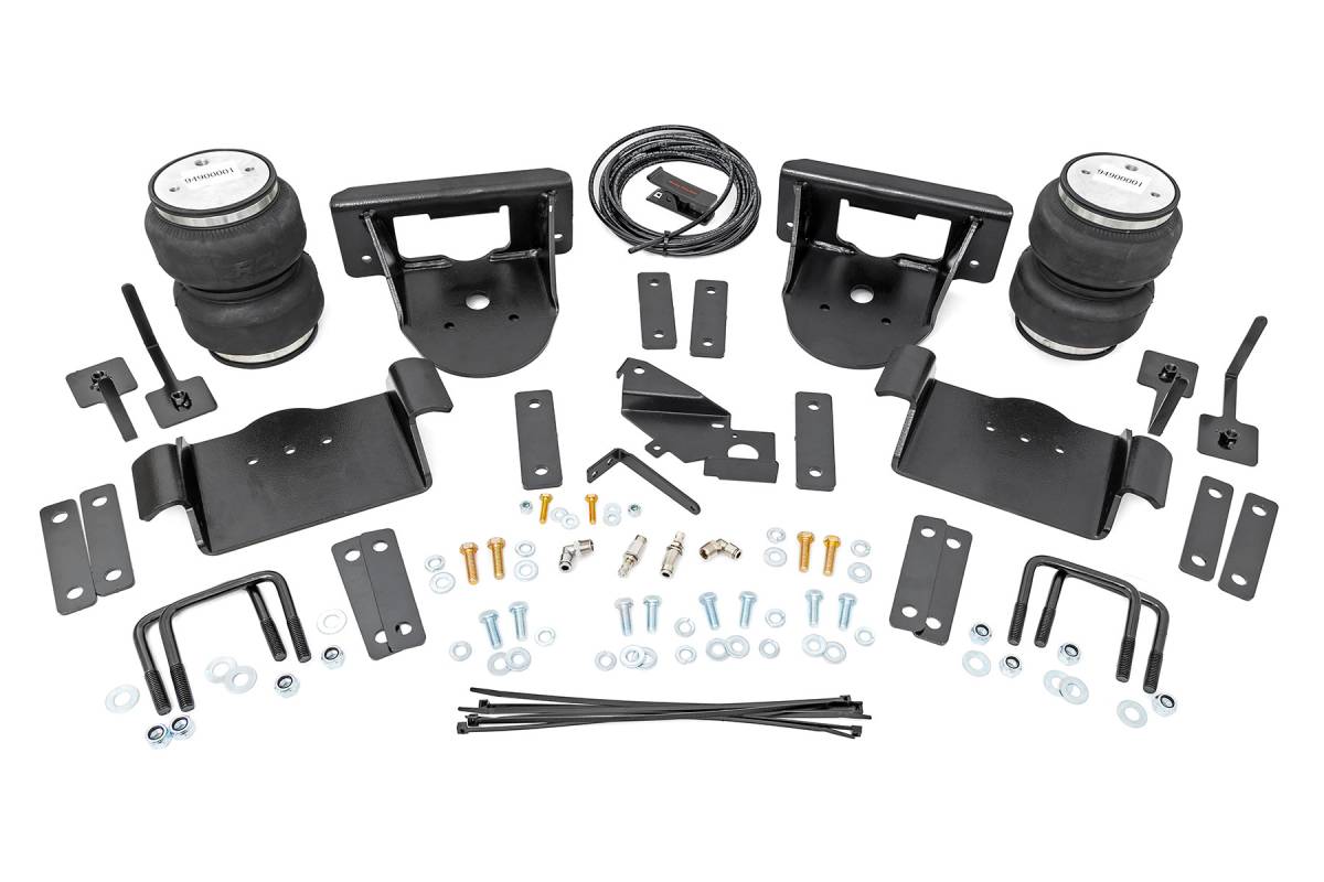 - Ideal Leveling: Is your truck your workhorse? The main attraction of a pickup is the ability to haul and tow as needed. However, due to the weight in the bed or the condition of the rear leaf springs, your vehicle may become un-level under load. At Rough Country, we've designed a solution to eliminate these concerns. Introducing Rough Country's Rear Air Spring Kit. Heavy-Duty Construction: Rough Country's Rear Air Spring Kit includes two high-quality, double convoluted air bags, reinforced with durable powder-coated steel brackets and DOT-approved airlines. Whether you're towing a trailer or hauling heavy loads, this kit helps ensure your vehicle remains level, alleviating the strain on your trailer's tongue weight. The kit features 1/4" push-to-connect air fittings for easy installation, along with all necessary bracketry for a secure fit. Rough Country's Air Spring Kit supports up to 5,000 lbs. of load, minimizing sway and preventing bottoming out while braking and steering. Easy Installation: Quick and simple setup for immediate use. Rough Country's kit can be installed at home with standard tools in just 5-6 hours, ensuring minimal downtime and fast, hassle-free installation. Onboard Air Compressor and Wireless Controller: For added convenience, Rough Country offers an optional onboard air compressor and wireless controller to easily adjust your air spring kit on the go. Control air pressure at the push of a button from the comfort of your vehicle. Reliable Warranty Coverage: Rough Country's Rear Air Spring Kit includes a limited lifetime warranty on the air springs and a two-year replacement warranty on the compressor, offering lasting protection against manufacturer defects. This industry-leading coverage ensures confidence in both quality and durability, so you can count on Rough Country to keep your truck performing at its best.