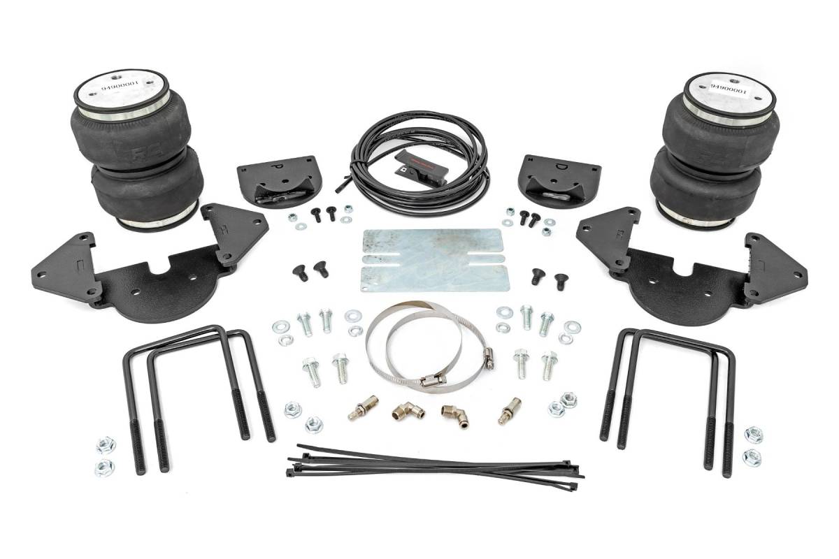 - Ideal Leveling: Is your truck your workhorse? The main attraction of a pickup is the ability to haul and tow as needed. However, due to the weight in the bed or the condition of the rear leaf springs, your vehicle may become un-level under load. At Rough Country, we've designed a solution to eliminate these concerns. Introducing Rough Country's Rear Air Spring Kit. Heavy-Duty Construction: Rough Country's Rear Air Spring Kit includes two high-quality, double convoluted air bags, reinforced with durable powder-coated steel brackets and DOT-approved airlines. Whether you're towing a trailer or hauling heavy loads, this kit helps ensure your vehicle remains level, alleviating the strain on your trailer's tongue weight. The kit features 1/4" push-to-connect air fittings for easy installation, along with all necessary bracketry for a secure fit. Rough Country's Air Spring Kit supports up to 5,000 lbs. of load, minimizing sway and preventing bottoming out while braking and steering. Easy Installation: Quick and simple setup for immediate use. Rough Country's kit can be installed at home with standard tools in just 5-6 hours, ensuring minimal downtime and fast, hassle-free installation. Onboard Air Compressor and Wireless Controller: For added convenience, Rough Country offers an optional onboard air compressor and wireless controller to easily adjust your air spring kit on the go. Control air pressure at the push of a button from the comfort of your vehicle. Reliable Warranty Coverage: Rough Country's Rear Air Spring Kit includes a limited lifetime warranty on the air springs and a two-year replacement warranty on the compressor, offering lasting protection against manufacturer defects. This industry-leading coverage ensures confidence in both quality and durability, so you can count on Rough Country to keep your truck performing at its best.
