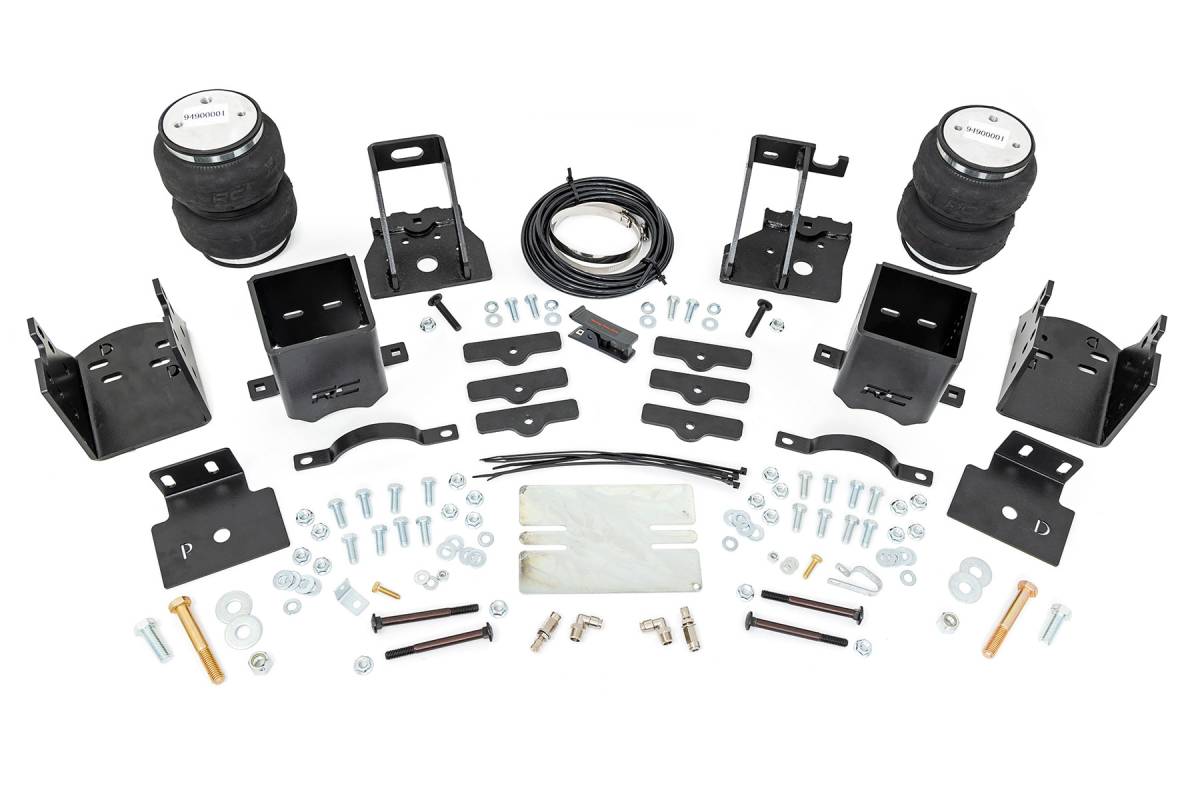 - Ideal Leveling: Is your truck your workhorse? The main attraction of a pickup is the ability to haul and tow as needed. However, due to the weight in the bed or the condition of the rear leaf springs, your vehicle may become un-level under load. At Rough Country, we've designed a solution to eliminate these concerns. Introducing Rough Country's Rear Air Spring Kit. Heavy-Duty Construction: Rough Country's Rear Air Spring Kit includes two high-quality, double convoluted air bags, reinforced with durable powder-coated steel brackets and DOT-approved airlines. Whether you're towing a trailer or hauling heavy loads, this kit helps ensure your vehicle remains level, alleviating the strain on your trailer's tongue weight. The kit features 1/4" push-to-connect air fittings for easy installation, along with all necessary bracketry for a secure fit. Rough Country's Air Spring Kit supports up to 5,000 lbs. of load, minimizing sway and preventing bottoming out while braking and steering. Easy Installation: Quick and simple setup for immediate use. Rough Country's kit can be installed at home with standard tools in just 5-6 hours, ensuring minimal downtime and fast, hassle-free installation. Onboard Air Compressor and Wireless Controller: For added convenience, Rough Country offers an optional onboard air compressor and wireless controller to easily adjust your air spring kit on the go. Control air pressure at the push of a button from the comfort of your vehicle. Reliable Warranty Coverage: Rough Country's Rear Air Spring Kit includes a limited lifetime warranty on the air springs and a two-year replacement warranty on the compressor, offering lasting protection against manufacturer defects. This industry-leading coverage ensures confidence in both quality and durability, so you can count on Rough Country to keep your truck performing at its best.
