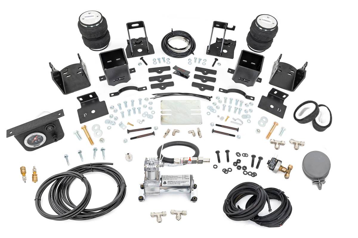 - Ideal Leveling: Is your truck your workhorse? The main attraction of a pickup is the ability to haul and tow as needed. However, due to the weight in the bed or the condition of the rear leaf springs, your vehicle may become un-level under load. At Rough Country, we've designed a solution to eliminate these concerns. Introducing Rough Country's Rear Air Spring Kit. Heavy-Duty Construction: Rough Country's Rear Air Spring Kit includes two high-quality, double convoluted air bags, reinforced with durable powder-coated steel brackets and DOT-approved airlines. Whether you're towing a trailer or hauling heavy loads, this kit helps ensure your vehicle remains level, alleviating the strain on your trailer's tongue weight. The kit features 1/4" push-to-connect air fittings for easy installation, along with all necessary bracketry for a secure fit. Rough Country's Air Spring Kit supports up to 5,000 lbs. of load, minimizing sway and preventing bottoming out while braking and steering. Easy Installation: Quick and simple setup for immediate use. Rough Country's kit can be installed at home with standard tools in just 5-6 hours, ensuring minimal downtime and fast, hassle-free installation. Onboard Air Compressor and Wireless Controller: For added convenience, Rough Country offers an optional onboard air compressor and wireless controller to easily adjust your air spring kit on the go. Control air pressure at the push of a button from the comfort of your vehicle. Reliable Warranty Coverage: Rough Country's Rear Air Spring Kit includes a limited lifetime warranty on the air springs and a two-year replacement warranty on the compressor, offering lasting protection against manufacturer defects. This industry-leading coverage ensures confidence in both quality and durability, so you can count on Rough Country to keep your truck performing at its best.