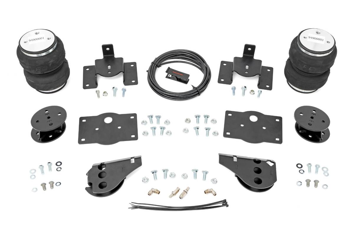 - Ideal Leveling: Is your truck your workhorse? The main attraction of a pickup is the ability to haul and tow as needed. However, due to the weight in the bed or the condition of the rear leaf springs, your vehicle may become un-level under load. At Rough Country, we've designed a solution to eliminate these concerns. Introducing Rough Country's Rear Air Spring Kit. Heavy-Duty Construction: Rough Country's Rear Air Spring Kit includes two high-quality, double convoluted air bags, reinforced with durable powder-coated steel brackets and DOT-approved airlines. Whether you're towing a trailer or hauling heavy loads, this kit helps ensure your vehicle remains level, alleviating the strain on your trailer's tongue weight. The kit features 1/4" push-to-connect air fittings for easy installation, along with all necessary bracketry for a secure fit. Rough Country's Air Spring Kit supports up to 5,000 lbs. of load, minimizing sway and preventing bottoming out while braking and steering. Easy Installation: Quick and simple setup for immediate use. Rough Country's kit can be installed at home with standard tools in just 5-6 hours, ensuring minimal downtime and fast, hassle-free installation. Onboard Air Compressor and Wireless Controller: For added convenience, Rough Country offers an optional onboard air compressor and wireless controller to easily adjust your air spring kit on the go. Control air pressure at the push of a button from the comfort of your vehicle. Reliable Warranty Coverage: Rough Country's Rear Air Spring Kit includes a limited lifetime warranty on the air springs and a two-year replacement warranty on the compressor, offering lasting protection against manufacturer defects. This industry-leading coverage ensures confidence in both quality and durability, so you can count on Rough Country to keep your truck performing at its best.