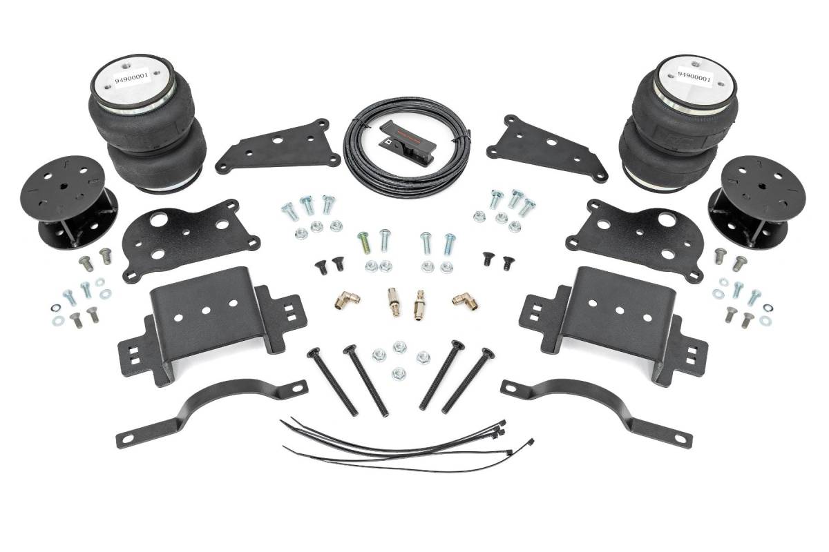 - Ideal Leveling. Is your truck your workhorse? The main attraction to the pick-up line is the accessibility to haul and tow as desired. However, due to the amount of weight in the bed, or the condition of the vehicle's rear leaf springs, this can cause the vehicle to be un-level when under load. Here at Rough Country, we created an innovative new product to ensure that these are troubles of the past. Introducing, Rough Country's Rear Air Spring Kit. Heavy-duty Construction. Rough Country's Rear Air Spring Kit features two RC branded high-quality double convoluted airbags complemented with DOT-approved airlines. Whether you plan on towing or hauling in the not-so-distant future Rough Country's Air Spring kit is the must-have accessory to ensure that your trailer is level reducing the weight off of the tongue of your trailer. Each kit offers 1/4" push connector fittings and all of the bracketry needed to ensure installation is lightning fast and secure! Rough Country's Air Spring kit provides up to 5,000 lbs. of load support to ensure that you experience less sway and bottoming out when braking and steering! Installation. With an estimated timeframe of 1-2 hours this full kit can be installed at home using standard tools and can be completed efficiently and quickly! Limited Lifetime Replacement Warranty. Rough Country's Rear Air Spring Kit is backed with a limited-lifetime replacement warranty towards manufacturer defects. As such, the product is protected from structural and workmanship damage after the date of purchase. With our industry-leading warranty give yourself peace of mind when using Rough Country's Suspension products!