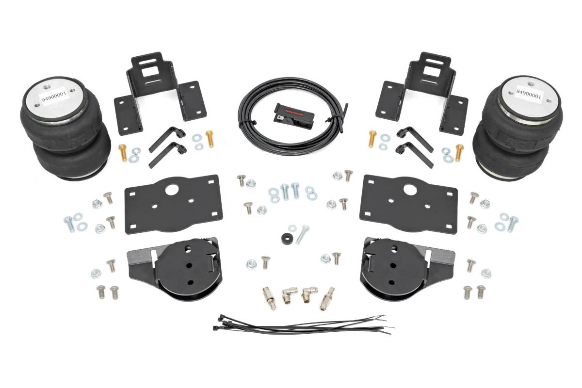 - Ideal Leveling. Is your truck your workhorse? The main attraction to the pick-up line is the accessibility to haul and tow as desired. However, due to the amount of weight in the bed, or the condition of the vehicle's rear leaf springs, this can cause the vehicle to be un-level when under load. Here at Rough Country, we created an innovative new product to ensure that these are troubles of the past. Introducing, Rough Country's Rear Air Spring Kit. Heavy-duty Construction. Rough Country's Rear Air Spring Kit features two RC branded high-quality double convoluted airbags complemented with DOT-approved airlines. Whether you plan on towing or hauling in the not-so-distant future Rough Country's Air Spring kit is the must-have accessory to ensure that your trailer is level reducing the weight off of the tongue of your trailer. Each kit offers 1/4" push connector fittings and all of the bracketry needed to ensure installation is lightning fast and secure! Rough Country's Air Spring kit provides up to 5,000 lbs. of load support to ensure that you experience less sway and bottoming out when braking and steering! Installation. With an estimated timeframe of 1-2 hours this full kit can be installed at home using standard tools and can be completed efficiently and quickly! Limited Lifetime Replacement Warranty. Rough Country's Rear Air Spring Kit is backed with a limited-lifetime replacement warranty towards manufacturer defects. As such, the product is protected from structural and workmanship damage after the date of purchase. With our industry-leading warranty give yourself peace of mind when using Rough Country's Suspension products!