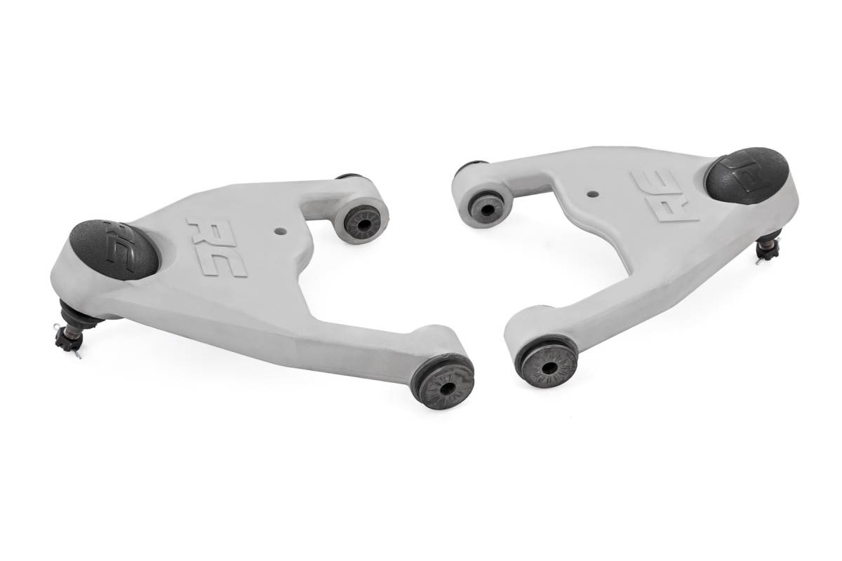 - Unmatched Strength and Durability: Take your truck to the next level with Rough Country's most durable Upper Control Arm yet! Crafted from forged solid aluminum, these Upper Control Arms deliver unmatched strength and long-lasting durability. The 1-piece forged design eliminates any welding weak spots, ensuring superior integrity that resists bending or breaking. Enhanced Articulation for Optimal Performance: Rough Country's Forged Upper Control Arms are equipped with POM ball joints for a greater range of motion, offering more wheel articulation compared to standard or OE replacements. These high-performance ball joints feature a Polyoxymethylene ball race with a low coefficient of friction, resulting in longer life and smoother movement. A larger ball diameter enhances articulation while the maintenance-free design keeps performance high. Plus, each ball joint is fully greaseable, ensuring ongoing smooth operation. Durable and Reliable Bushings: Additionally, Rough Country's Forged Upper Control Arms include durable OEM-style rubber bushings, engineered for superior quality and reliable performance, making them a durable choice for any lifted application.