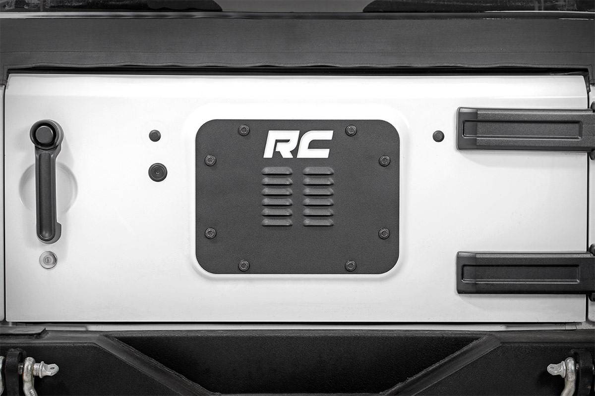 - Delete your spare tire and dress up the back of your JK with Rough Country's Spare Tire Delete Vent Cover for Jeep JK! This stylish, louvered cover fits perfectly over your JK s rear vent, drastically improving the looks of your Jeep after removing the spare tire and carrier.Buying a 5th tire and wheel gets expensive, and many aftermarket tires and wheels are simply too large to use on a rear tire carrier. Delete your spare tire and improve the look of this now visible area with this easy to install product.Each Vent Cover is laser-cut and powdercoated black for a precise fit and a long lasting lifespan of good looks. Includes a lifetime replacement warranty!