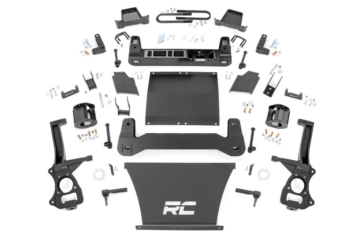 - Explore New Heights: Transform your truck with Rough Country's 6-inch Suspension Lift, perfectly designed to enhance the bold, aggressive styling of GM s all-new fourth-generation Sierra 1500 Denali and Silverado 1500 High Country. These models, already equipped with GM s adaptive ride control package, are taken to the next level with Rough Country's lift kit giving your vehicle a commanding presence on and off the road. Whether you're tackling tough trails or cruising through city streets, the Rough Country 6-inch Lift ensures improved performance and head-turning appeal. Innovative Design and Construction: When changing a vehicle's suspension, the key to preserving ride quality is keeping the geometry of all suspension components as close to their factory angles as possible. This suspension kit combines the use of durable steel knuckles, differential brackets, and drop cross members to reduce cv angles and simulate factory angles all while achieving new heights. Featuring a set of upper strut spacers that offer uncompromised strength and rigidity, gaining lift height is no issue. Completing the rear of this suspension kit is a set of rear blocks, shocks, and U-bolts that allow you to retain factory-like geometry.