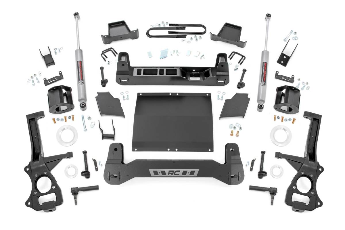 - Explore New Heights: GMC's fourth generation Sierra 1500 features an impressive all-new design that's built from the ground up, with aggressive angles and head-turning stylings that fit in beautifully when transformed with Rough Country's 6-inch Suspension Lift. Innovative Design and Construction: When changing a vehicle's suspension, the key to preserving ride quality is keeping the geometry of all suspension components as close to their factory angles as possible. This suspension kit combines the use of durable steel knuckles, differential brackets, and drop cross members to reduce cv angles and simulate factory angles all while achieving new heights. Featuring a set of upper strut spacers that offer uncompromised strength and rigidity, gaining lift height is no issue. Completing the rear of this suspension kit is a set of rear blocks, shocks, and U-bolts that allow you to retain factory-like geometry. This combined setup provides enough clearance to run 35" tires without additional modifications. We didn't want to limit you to one standard kit. Rough Country's 6-inch kit is configurable with all the shock options that we offer. This allows you to choose which shock series you want! Ranging from our nitrogen-charged N3 shocks to our Vertex reservoir shocks the power to choose is in your hands. Installation: With minor cutting and a strut compressor required to install, an estimated timeframe of 8-10 hours is recommended to complete this full installation. This full kit can be installed at home and can be completed efficiently and quickly! Limited Lifetime Replacement Warranty: Rough Country's 6" Suspension Lift Kit is backed with a limited lifetime replacement warranty towards manufacturer defects. As such, the product is protected from structural and workmanship damage after the date of purchase. With our industry-leading warranty give yourself peace of mind when using Rough Country's Suspension products!