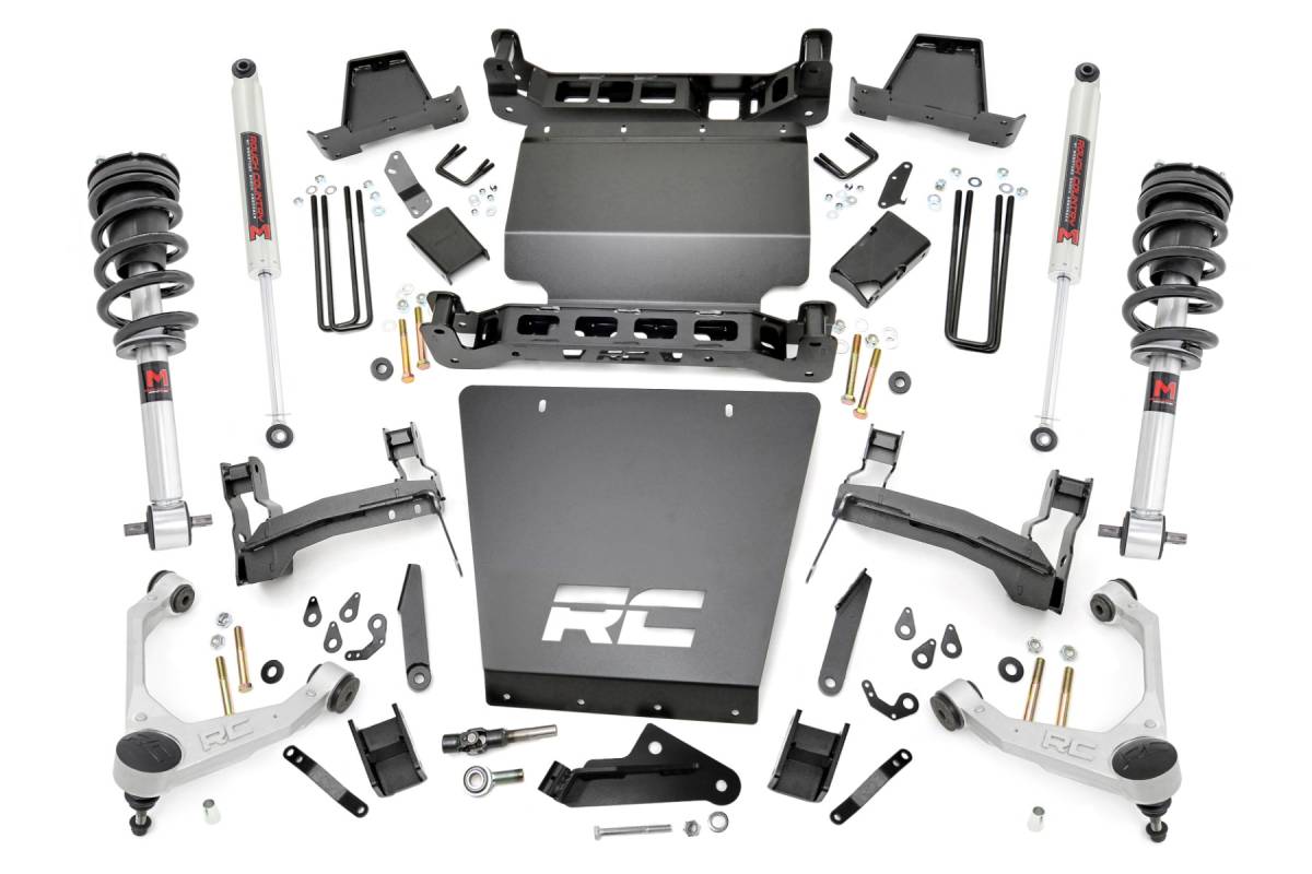 - Command Attention with a Superior Lift Solution: Transform your Chevy Silverado 1500 or GMC Sierra 1500 into a bold, trail-ready machine with Rough Country's 7-Inch Lift Kit. This aggressive upgrade delivers increased ground clearance and a leveled stance while maintaining a smooth, factory-like ride both on and off the pavement. Designed to accommodate larger wheels and 35" tires, this kit ensures your truck not only performs better but turns heads wherever it goes. Precision Engineering Meets Rugged Performance: Preserving factory ride quality starts with proper suspension geometry and this kit nails it. Engineered with robust control arm brackets, differential drop brackets, and crossmembers, it reduces CV angles and maintains near-OEM suspension alignment. The heavy-duty replacement struts offer superior strength and rigidity, making lift height gains effortless and dependable. Built for Strength and Longevity: This kit features Rough Country's forged aluminum control arms - lightweight yet incredibly strong to withstand the demands of lifted driving. These arms are designed for optimal ball joint articulation, reducing wear and increasing motion range.