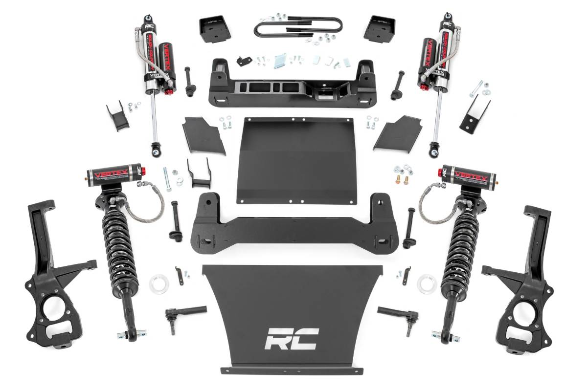 - Transform your fifth-generation GMC Sierra 1500 with Rough Country's 6-Inch Suspension Lift Kit, engineered to elevate both your stance and your off-road prowess. Designed to complement the truck's aggressive factory styling, this all-in-one lift solution delivers a bold, leveled look and the clearance needed to run 35x12.50 tires on 10-inch wide wheels. Front-to-Rear Lift & Leveling: Gain a clean, aggressive stance with improved ground clearance for better trail performance and street presence. Precision Engineering, Off-Road Ready: This kit features a high-clearance crossmember that maintains optimal suspension geometry while maximizing off-road capability. Extreme-duty cast knuckles and heavy-duty fabricated blocks provide rugged durability built to endure the harshest driving conditions. Factory Fitment, Simplified Install: Enjoy a bolt-on installation that requires no strut disassembly and no differential trimming, saving you time and preserving the factory integrity of your Sierra. The laser-cut, CAD-designed components ensure a perfect fit and unmatched strength. Retains Stock Handling & Compatibility: With factory track width maintained, you keep the truck's original handling characteristics while minimizing wear and tear. This kit also works with all Rough Country shock/strut options, from nitrogen-charged N3s to the premium Vertex reservoir, so you can tailor your ride to your driving needs. Every kit includes front and rear crossmembers, a durable skid plate for enhanced chassis strength, and Rough Country's Limited Lifetime Replacement Guarantee for complete peace of mind.