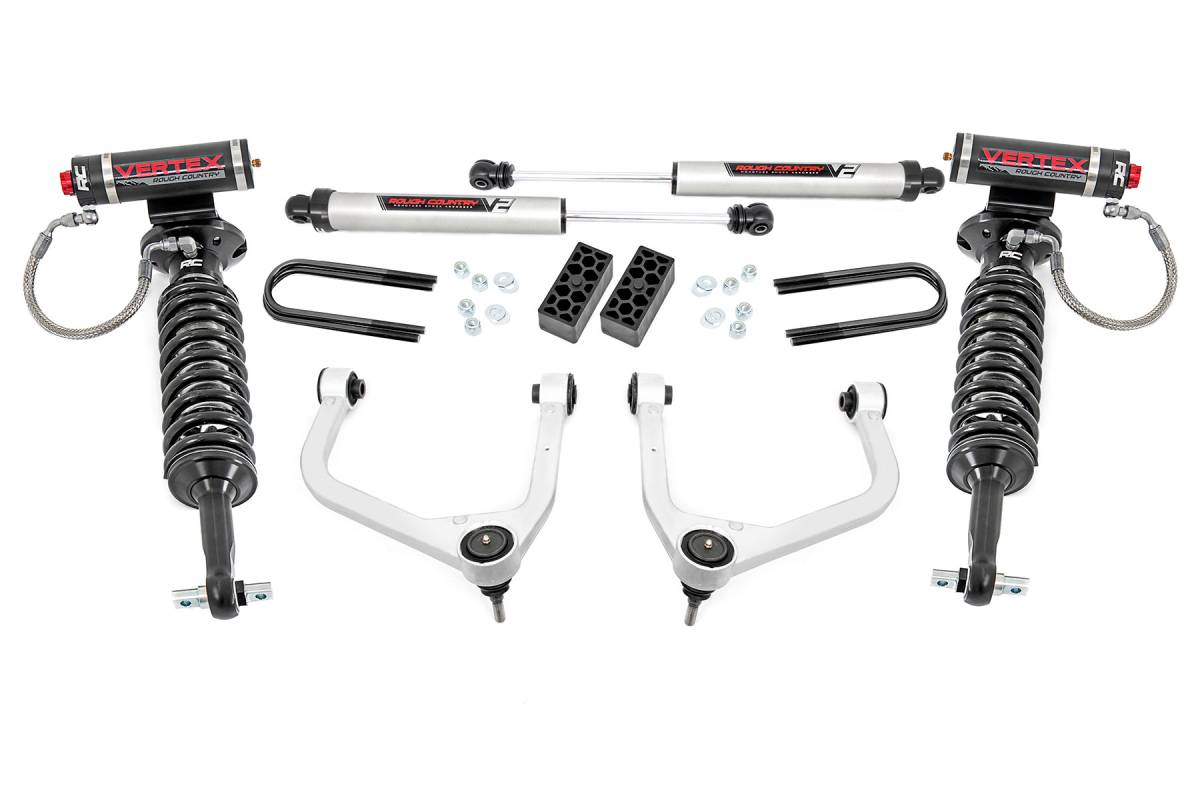 - Explore New Heights: GM's fourth-generation Silverado 1500 features an impressive all-new design that's built from the ground up, with aggressive angles and head-turning stylings that fit in beautifully when transformed with Rough Country's 3.5-inch Suspension Lift. Innovative Design and Construction: When changing a vehicle's suspension, the key to preserving ride quality is keeping the geometry of all suspension components as close to their factory angles as possible. Rough Country's 3.5in lift features a set of forged aluminum upper control arms to provide the correct suspension geometry in our most durable control arm to date! This perfect-height lift is a great choice for anyone who wants more than a simple level but doesn't quite want the full height of a 6-inch option. This kit lifts and levels the front of the vehicle with the rear, offering enough increased ground clearance to run up to 295/55R20 tires with an improved, aggressive look. We didn't want to limit you to one standard kit. Rough Country's 3.5-inch kit is configurable with all the shock options that we offer. This allows you to choose which shock series you want! Ranging from our nitrogen-charged N3 shocks to our Vertex reservoir shocks the power to choose is in your hands. Installation: Requiring the use of a strut compressor to install, an estimated timeframe of 5-6 hours is recommended to complete this full installation. This full kit can be installed at home and can be completed efficiently and quickly! Limited Lifetime Replacement Warranty: Rough Country's 3.5" Suspension Lift Kit is backed with a limited lifetime replacement warranty towards manufacturer defects. As such, the product is protected from structural and workmanship damage after the date of purchase. With our industry-leading warranty give yourself peace of mind when using Rough Country's Suspension products!