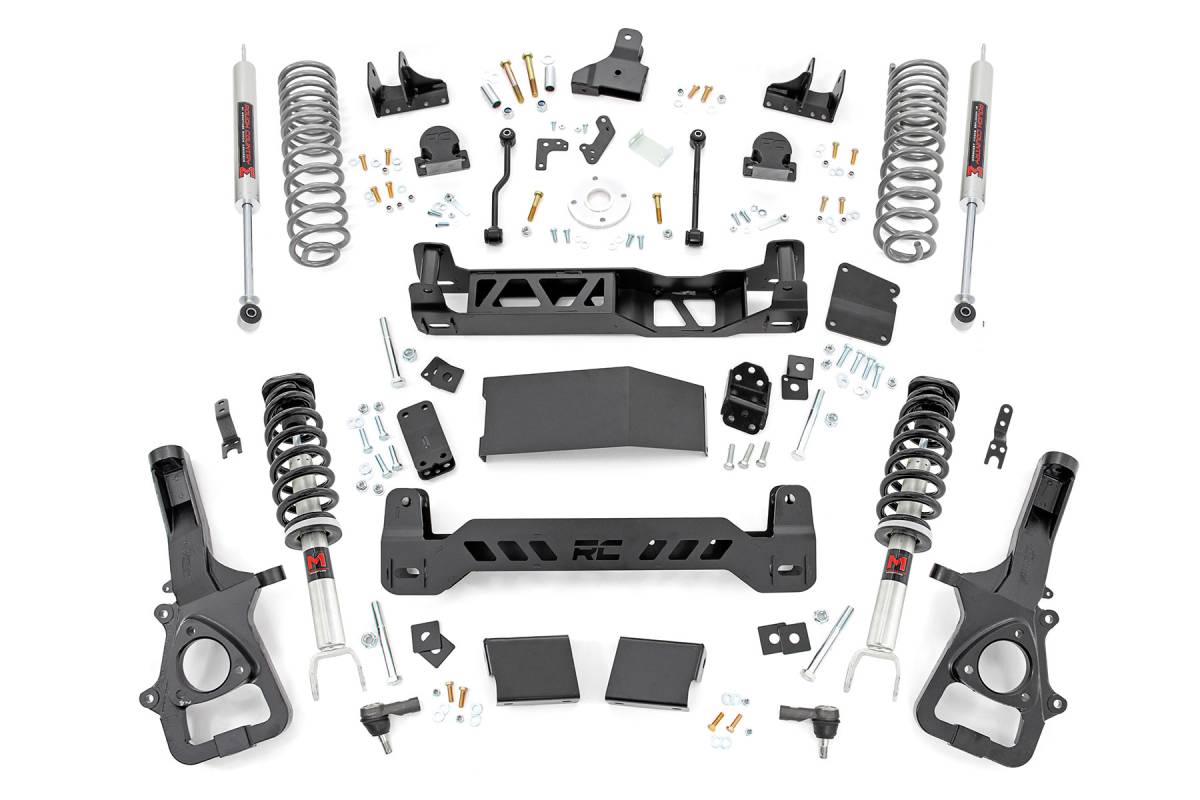 - Transform your 5th generation RAM 1500 into an unstoppable off-road BEAST with Rough Country's complete 6in Suspension Lift Kit. This all-inclusive system delivers an aggressive, commanding stance that perfectly complements your truck's rugged new design. Preserve Your Smooth Factory Ride: Experience the same comfortable and controlled driving feel you love. Our kit maintains a smooth factory-like ride quality so every journey, on-road or off, is just as comfortable as before. Boost Your Ground Clearance for Ultimate Off-Road Confidence: Gain plenty of added clearance to tackle the toughest trails and obstacles with ease. The 6-inch lift lets you run up to massive 35-inch tires for a bold look and enhanced off-road capability. Achieve a Balanced, Aggressive Stance: Level your RAM's front and rear for a sleek, aggressive profile that turns heads everywhere you go. The kit includes precision-engineered front and rear crossmembers, each laser-cut with the iconic RC logo for a fierce yet streamlined appearance. Optimized Ride Quality with Application-Specific Springs: Enjoy improved handling, ride comfort, and load support thanks to dual-rate rear coil springs (optional upgrade) tailored for your RAM.