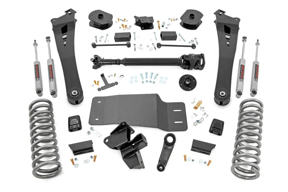 - Commanding Lift. Confident Performance: Transform your RAM 3500 with Rough Country's 5-Inch Lift Kit, engineered for bold looks and off-road domination. Featuring linear coil springs, a heavy-duty front driveshaft, and application-valved N3 shock absorbers, this kit delivers increased ground clearance, leveled stance, and trail-tested performance, all while maintaining a smooth, factory-like ride. Precision Suspension Engineering: Maintaining proper suspension geometry is critical for both on- and off-road control. This kit includes a drop pitman arm to correct steering angles and a track bar drop bracket to keep your front axle perfectly centered, ensuring stable, predictable handling at every turn. Heavy-Duty Radius Arms: Custom radius arms bolt directly to factory mounts and retain factory-like angles. Outfitted with premium rubber bushings, they minimize vibration and noise while maximizing ride comfort and suspension travel. Linear Coil Springs for Consistency: Front and rear linear-rate coil springs offer a reliable, controlled ride with balanced articulation and load handling, perfect for daily driving, towing, or backcountry exploring. Upgraded Front Driveshaft Included: This kit comes complete with a high-clearance front driveshaft designed to accommodate added articulation and drivetrain angles, no need for costly aftermarket upgrades. Includes N3 Series Shocks: Rough Country's N3 shocks are specifically valved for your RAM 3500, delivering balanced performance both on the highway and in rugged off-road environments. Clears 37-Inch Tires with Ease: Run aggressive 37-inch tires with confidence. This kit gives your RAM the clearance it needs for true off-road capability and a head-turning stance.