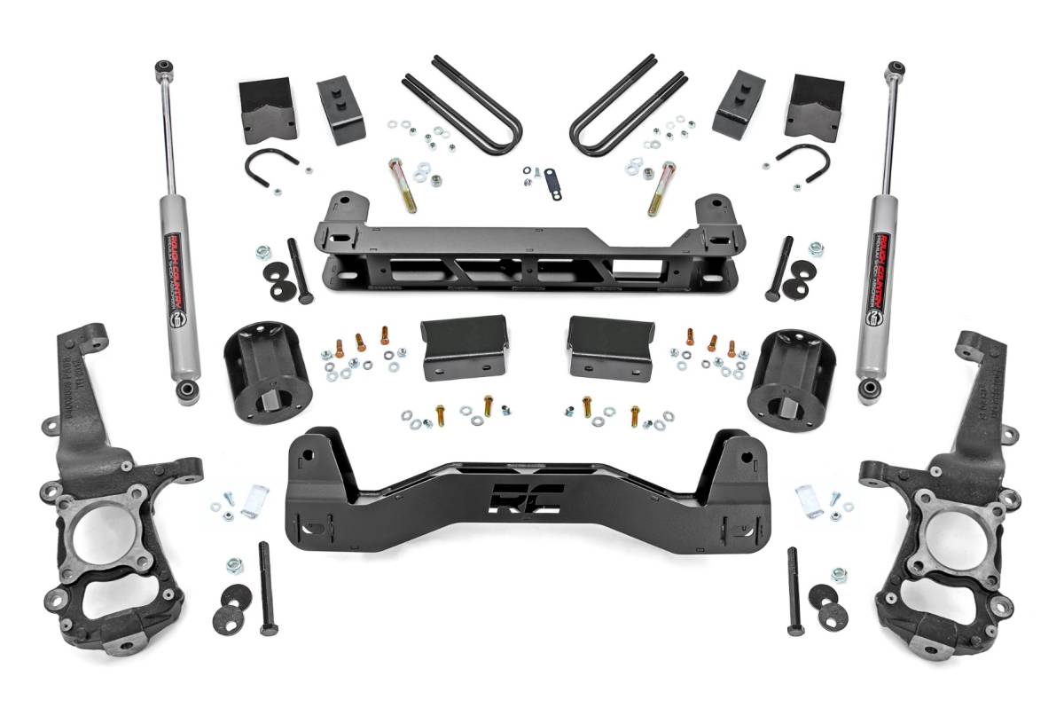 - Turn your Ford F-150 into the ultimate road-and-trail champion with Rough Country's 6-Inch Lift Kit. Designed to conquer everything from rugged trails to your daily drive, this kit delivers the perfect stance, unbeatable ground clearance, and the confidence to tackle any challenge. It enhances ride quality while giving your truck the bold, capable look your adventures demand. This isn't just a lift-it's a complete truck upgrade. Serious Ground Clearance: More room for adventure! This lift gives your F-150 the height it needs to clear obstacles on the trail and look commanding on the road. Levels Front and Rear: Say farewell to that factory nose-down look. This kit evens things out, giving your truck a clean, aggressive stance that screams confidence. Precision Engineered Aluminum Knuckles: A standout feature you won't find with any other brand. Engineered to outperform steel, these knuckles are 50% lighter, delivering improved handling and a better ride quality. Outstanding corrosion resistance ensures superior performance and long-lasting durability, making them the ultimate choice for any terrain. Installation and Warranty: Transform your F-150 with our all-inclusive 6-inch Lift Kit, featuring durable aluminum knuckles, crossmembers, and all the hardware for a factory-like setup with extra ground clearance. Plus, enjoy peace of mind with Rough Country's limited lifetime warranty, protecting against structural and workmanship defects. This isn't your average lift kit. With premium components and attention to detail, it's designed to handle everything from weekend overlanding to weekday commutes.