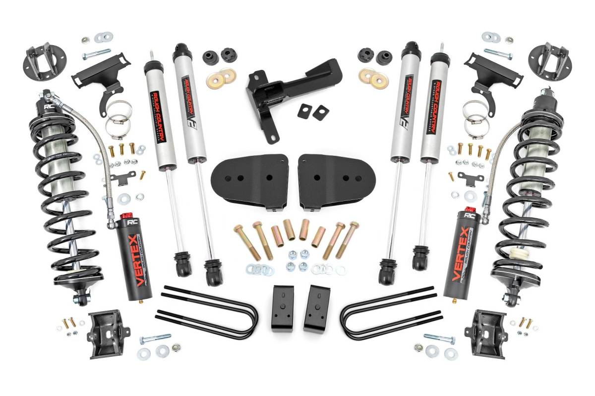 - Explore New Heights. Give your fifth-generation Ford Super Duty superior lift height with Rough Country's 3-inch Coilover Suspension Lift Kit! This all-inclusive kit comes with everything you need for a total transformation of your truck. Run up to 35in tires while preserving the smooth, factory ride quality with this impressive upgrade. Durable Components. When changing a vehicle's suspension, the key to preserving ride quality is keeping the geometry of all suspension components as close to their factory angles as possible. Rough Country's new 3-inch Suspension Lift features a set of ultra-durable radius arm drop brackets, precision fit to bolt right into the factory mounts for an easier install and a more factory-like angle. Utilizing this conversion kit you're removing the factory independent coil shock and coil set-up and replacing it with a massive 2.5in piston, nitrogen-charged, 8-stage adjustable Vertex Coilover. Rough Country's Vertex Coilovers feature a monotube design with an external reservoir for increased oil capacity and damping sensitivity. When it comes to investing in a high-end kit, you ll be pleased to find that Rough Country's 2.5in piston design is beefier and offers an impressive 56% greater fluid capacity than the average reservoir shock. Each kit is paired with a monotube shock that provides optimal damping control. Installation. Requiring cutting and drilling to install, an estimated timeframe of 6-10 hours is recommended to complete this full installation. This full kit can be installed at home and can be completed efficiently and quickly! Limited Lifetime Replacement Warranty. Rough Country's 3-inch Coilover Suspension Lift Kit is backed with a limited lifetime replacement warranty towards manufacturer defects. As such, the product is protected from structural and workmanship damage after the date of purchase. With our industry-leading warranty give yourself peace of mind when using Rough Country's Suspension products!
