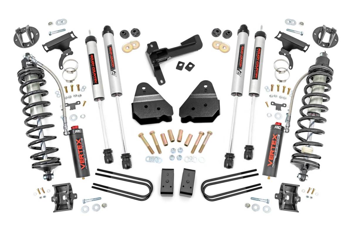 - Explore New Heights. Give your Ford Super Duty superior lift height with Rough Country's 3-inch Coilover Suspension Lift Kit! This all-inclusive kit comes with everything you need for a total transformation of your truck. Run up to 35in tires while preserving the smooth, factory ride quality with this impressive upgrade. Durable Components. When changing a vehicle's suspension, the key to preserving ride quality is keeping the geometry of all suspension components as close to their factory angles as possible. Rough Country's new 3-inch Suspension Lift features a set of ultra-durable radius arm drop brackets, precision fit to bolt right into the factory mounts for an easier install and a more factory-like angle. Utilizing this conversion kit you're removing the factory independent coil shock and coil set-up and replacing it with a massive 2.5in piston, nitrogen-charged, 8-stage adjustable Vertex Coilover. Rough Country's Vertex Coilovers feature a monotube design with an external reservoir for increased oil capacity and damping sensitivity. When it comes to investing in a high-end kit, you ll be pleased to find that Rough Country's 2.5in piston design is beefier and offers an impressive 56% greater fluid capacity than the average reservoir shock. Each kit is paired with a monotube shock that provides optimal damping control. Installation. Requiring cutting and drilling to install, an estimated timeframe of 6-10 hours is recommended to complete this full installation. This full kit can be installed at home and can be completed efficiently and quickly! Limited Lifetime Replacement Warranty. Rough Country's 3-inch Coilover Suspension Lift Kit is backed with a limited lifetime replacement warranty towards manufacturer defects. As such, the product is protected from structural and workmanship damage after the date of purchase. With our industry-leading warranty give yourself peace of mind when using Rough Country's Suspension products!