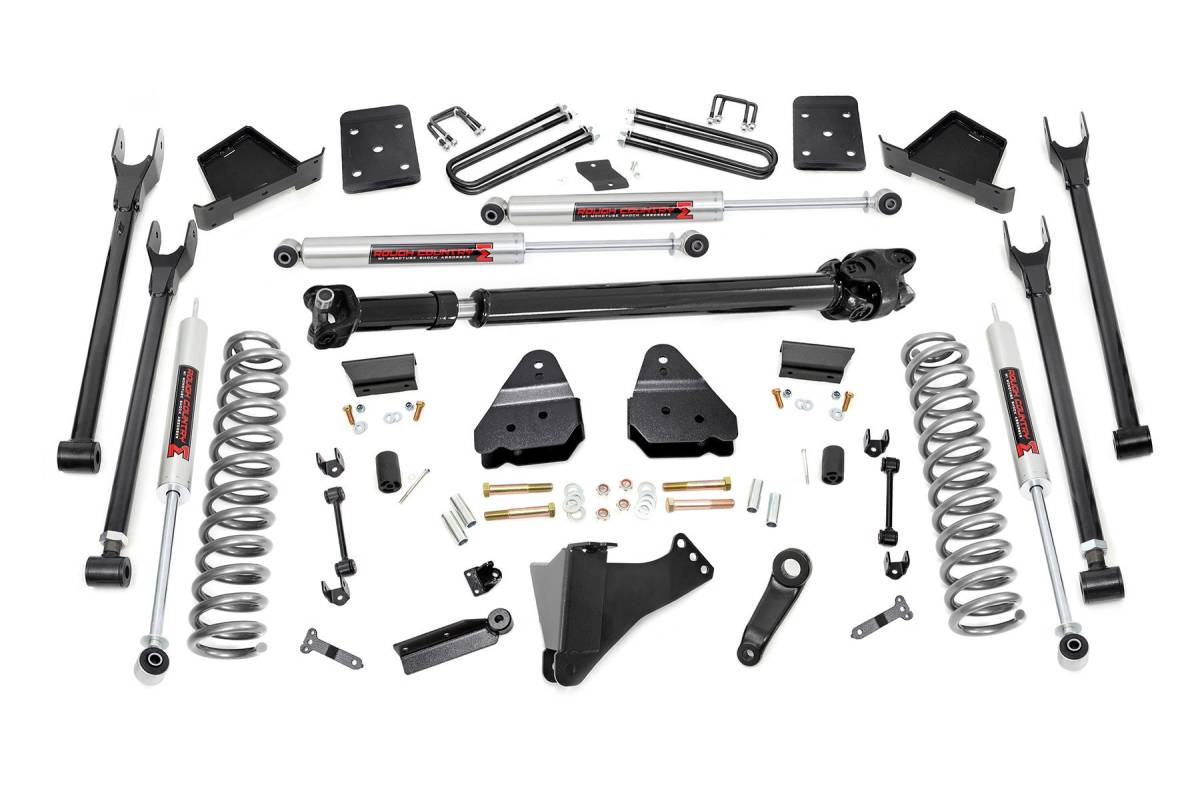 - Gain greater travel and improved handling while adding ground clearance and aggressive style with Rough Country's 4-Link F-250 Lift Kit. This innovative kit allows you to replace your factory arms with a 4-Link setup, using Rough Country's durable, fixed upper arms and adjustable lower control arms. A set of radius arm drop brackets maintain proper geometry and allow for proper caster setting, which is crucial to maintain factory handling. This kit includes a set of lifted coil springs, radius arm drop-brackets, and ultra-durable, fabricated Anti-wrap rear blocks that prevent binding and axle wrap. This kit also includes stainless steel extended brake lines and brake line brackets to ensure you have everything you need to install your lift. Best of all, this kit features Rough Country's Nitrogen-Charged N2.0 Shock Absorbers for the ultimate balance in off-road performance and a smooth highway ride. Includes Rough Country's Lifetime Replacement Warranty