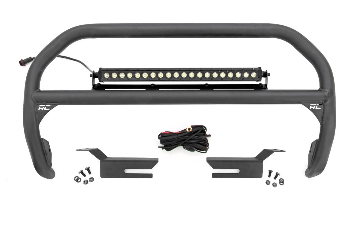 - Outfit your 2021 Bronco right with Rough Country's Nudge bar. This durable 3-inch thick tubular steel bull bar provides unbeatable protection for the front side of your vehicle all while offering multiple LED mounting solutions to provide ample lighting for the trail ahead. This easy-to-install bull bar features a 100% bolt-on installation process, giving you a simple way to add this eye-catching upgrade that provides protection from hazards on and off-road. Each Nudge Bar is coated with corrosion-resistant black powder coat to ensure a long-lifespan for years to come. Rough Country's Nudge Bar can be equipped with four round LED lights, or a single row 20" LED light bar! Rough Country's all-weather LED lights feature a durable, die-cast aluminum housing and include a premium, waterproof, flat-wound, braided wiring harness with toggle switch and in-line fuse.