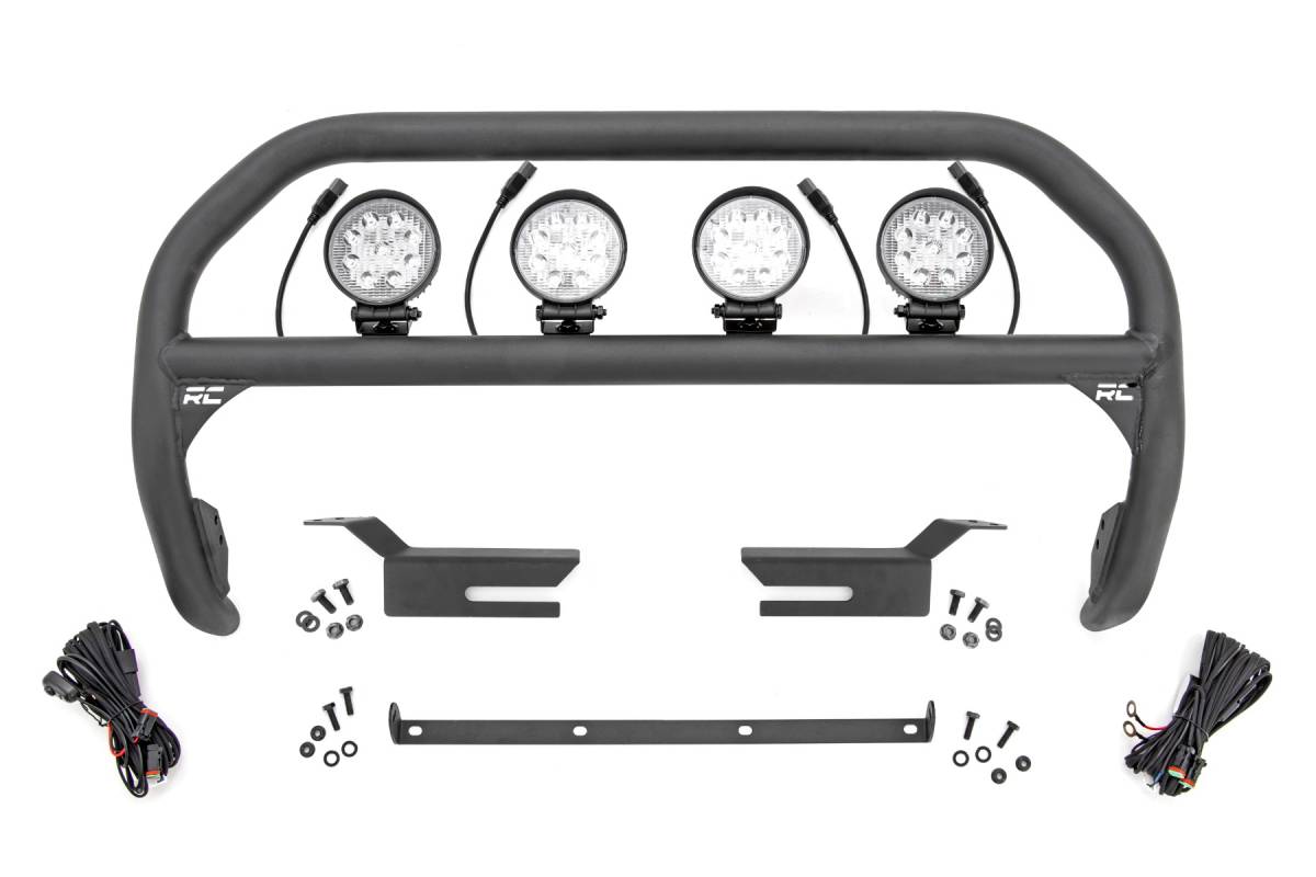 - Outfit your 2021 Bronco right with Rough Country's Nudge bar. This durable 3-inch thick tubular steel bull bar provides unbeatable protection for the front side of your vehicle all while offering multiple LED mounting solutions to provide ample lighting for the trail ahead. This easy-to-install bull bar features a 100% bolt-on installation process, giving you a simple way to add this eye-catching upgrade that provides protection from hazards on and off-road. Each Nudge Bar is coated with corrosion-resistant black powder coat to ensure a long-lifespan for years to come. Rough Country's Nudge Bar can be equipped with four round LED lights, or a single row 20" LED light bar! Rough Country's all-weather LED lights feature a durable, die-cast aluminum housing and include a premium, waterproof, flat-wound, braided wiring harness with toggle switch and in-line fuse.