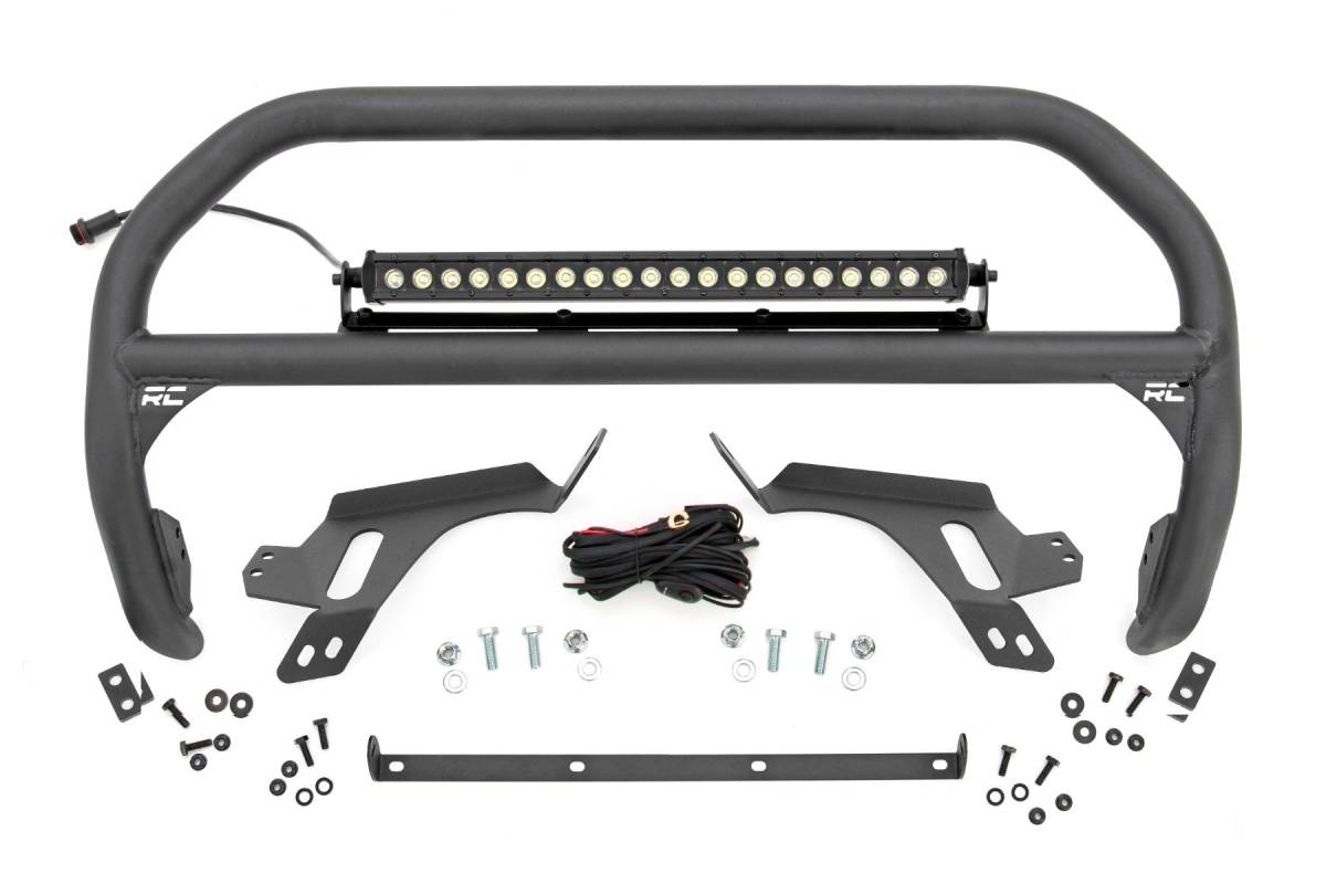 - Tough Protection, Bold Style: Outfit your Ford Bronco Sport with Rough Country's Nudge Bar for the ultimate blend of strength and style. Crafted from durable 2-inch tubular steel, this bull bar adds a rugged layer of front-end protection while giving your SUV a commanding look on or off the trail. Installation Notice: This Nudge Bar requires cutting and drilling for proper installation. With careful attention and standard tools, you can achieve a secure, custom fit that enhances both protection and appearance. Built to Last: Finished in a corrosion-resistant black powder coat, this Nudge Bar is engineered to withstand the elements and maintain its sleek appearance for years of use. Lighting Ready: Take on the night with multiple lighting options to suit your needs. Choose from a 20" Black Series LED Light Bar (7200 lumens), a 20" Spectrum Series Light Bar (24,300 lumens), or four 4" round LED lights (8640 lumens). Each lighting setup includes a durable, die-cast aluminum housing and a waterproof, braided wiring harness for reliable all-weather performance. Reliable Coverage: The Nudge Bar is backed by Rough Country's 5-year limited warranty, and all lighting options include a 3-year limited warranty for added peace of mind.
