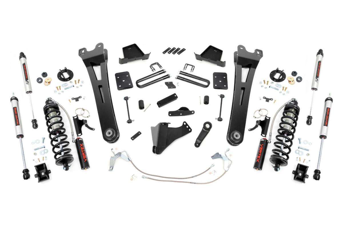 - Superior Ride Quality. Take your second-generation Ford Super Duty to new heights with Rough Country's 6-inch Radius Arm Coilover Conversion Suspension Lift! This all-inclusive kit comes with everything you need for a total transformation of your truck. Run up to 37in tires while preserving the smooth, factory ride quality with this impressive upgrade. Durable Components. When changing a vehicle's suspension, the key to preserving ride quality is keeping the geometry of all suspension components as close to their factory angles as possible. Rough Country's new 6-inch Radius Arm Suspension Lift features a set of ultra-durable Radius Arms, precision fit to bolt right into the factory mounts for an easier install and a more factory-like angle. At 27lbs each, these beefy, upgraded Radius Arms dwarf stock equipment and feature durable rubber bushings for maximum vibration absorption. Rough Country's 6" Radius Coilover Conversion Lift Kit features top-mounted reservoir brackets and coil-over mounts constructed from 1/4-inch steel. Utilizing this conversion kit you're removing the factory independent coil shock and coil set-up and replacing it with a massive 2.5in piston, nitrogen-charged, 8-stage adjustable Vertex Coilover.