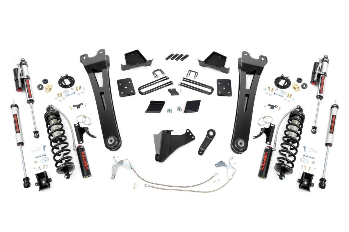 - Superior Ride Quality. Take your third-generation Ford Super Duty to new heights with Rough Country's 6-inch Radius Arm Coilover Conversion Suspension Lift! This all-inclusive kit comes with everything you need for a total transformation of your truck. Run up to 37in tires while preserving the smooth, factory ride quality with this impressive upgrade. Durable Components. When changing a vehicle's suspension, the key to preserving ride quality is keeping the geometry of all suspension components as close to their factory angles as possible. Rough Country's new 6-inch Radius Arm Suspension Lift features a set of ultra-durable Radius Arms, precision fit to bolt right into the factory mounts for an easier install and a more factory-like angle. At 27lbs each, these beefy, upgraded Radius Arms dwarf stock equipment and feature durable rubber bushings for maximum vibration absorption. Rough Country's 6" Radius Coilover Conversion Lift Kit features top-mounted reservoir brackets and coil-over mounts constructed from 1/4-inch steel. Utilizing this conversion kit you're removing the factory independent coil shock and coil set-up and replacing it with a massive 2.5in piston, nitrogen-charged, 8-stage adjustable Vertex Coilover.