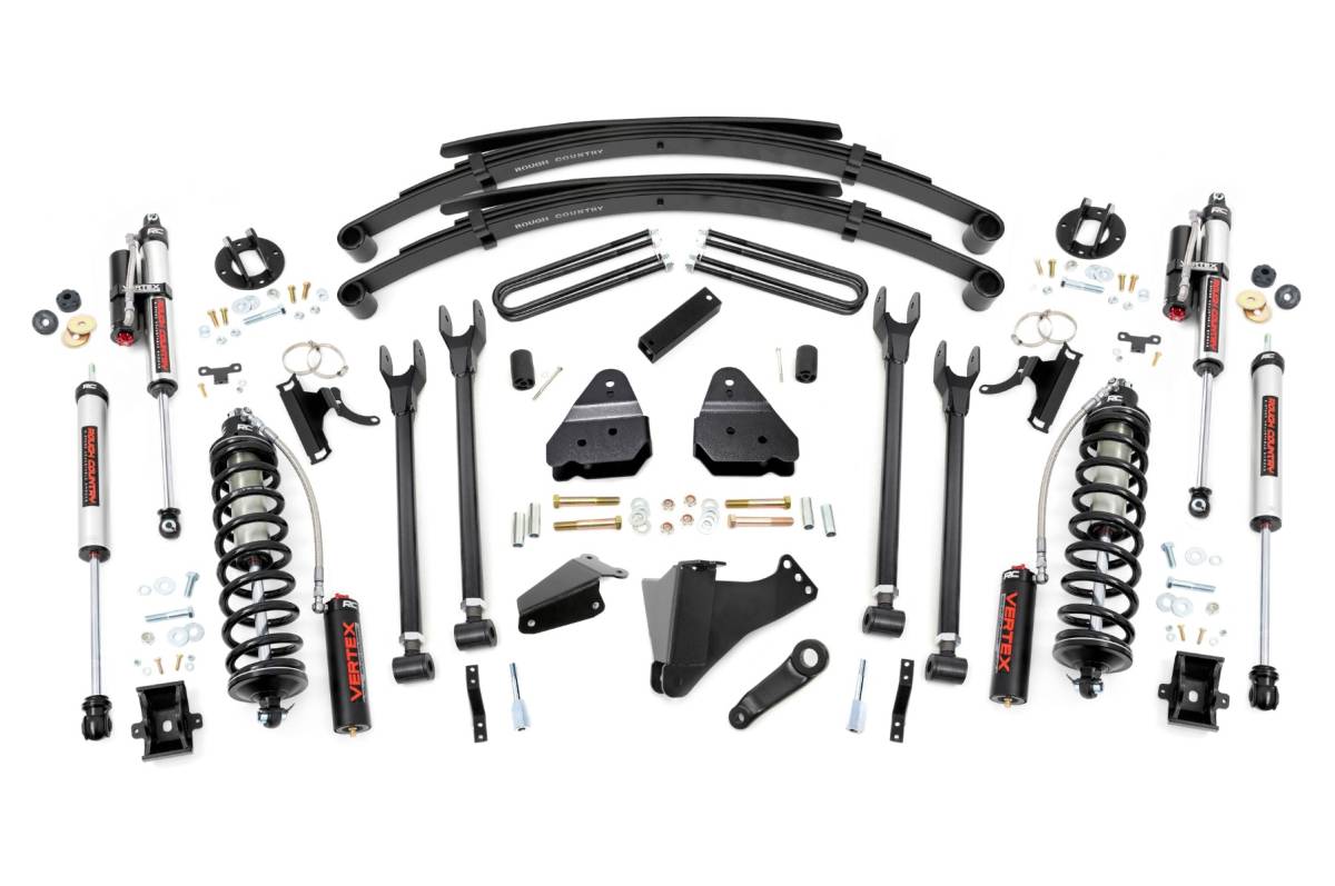 - Superior Ride Quality. Give your first-generation Ford Super Duty an impressive upgrade and incredible ride quality with Rough Country's 4-Link Coilover Conversion Lift Kit! This must-have kit is the pinnacle of suspension upgrades. Providing ride height adjustability, increased dampening, and killer good looks. You're sure to set yourself apart from the pack. This innovative kit allows you to replace your factory arms with a 4-Link setup, using Rough Country's durable, fixed upper arms and adjustable lower control arms. A set of radius arm drop brackets maintain proper geometry and allow for proper caster setting, which is crucial to maintaining factory handling. Durable Components. Rough Country's 6" 4-Link Coilover Conversion Lift Kit features top-mounted reservoir brackets and coil-over mounts constructed from 1/4-inch steel. Utilizing this conversion kit you're removing the factory independent coil shock and coil set-up and replacing it with a massive 2.5in piston, nitrogen-charged, 8-stage adjustable Vertex Coilover.