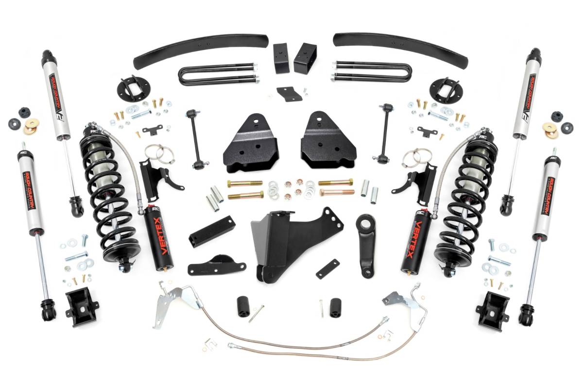- Explore New Heights. Give your second-generation Ford Super Duty superior lift height with Rough Country's 6-inch Coilover Suspension Lift Kit! This all-inclusive kit comes with everything you need for a total transformation of your truck. Run up to 37in tires while preserving the smooth, factory ride quality with this impressive upgrade. Durable Components. When changing a vehicle's suspension, the key to preserving ride quality is keeping the geometry of all suspension components as close to their factory angles as possible. Rough Country's new 6-inch Suspension Lift features a set of ultra-durable radius arm drop brackets, precision fit to bolt right into the factory mounts for an easier install and a more factory-like angle. Utilizing this conversion kit you're removing the factory independent coil shock and coil set-up and replacing it with a massive 2.5in piston, nitrogen-charged, 8-stage adjustable Vertex Coilover. Rough Country's Vertex Coilovers feature a monotube design with an external reservoir for increased oil capacity and damping sensitivity. When it comes to investing in a high-end kit, you ll be pleased to find that Rough Country's 2.5in piston design is beefier and offers an impressive 56% greater fluid capacity than the average reservoir shock. Each kit is paired with a monotube shock that provides optimal damping control. Installation. Requiring cutting and drilling to install, an estimated timeframe of 6-10 hours is recommended to complete this full installation. This full kit can be installed at home and can be completed efficiently and quickly! Limited Lifetime Replacement Warranty. Rough Country's 6-inch Coilover Suspension Lift Kit is backed with a limited lifetime replacement warranty towards manufacturer defects. As such, the product is protected from structural and workmanship damage after the date of purchase. With our industry-leading warranty give yourself peace of mind when using Rough Country's Suspension products!