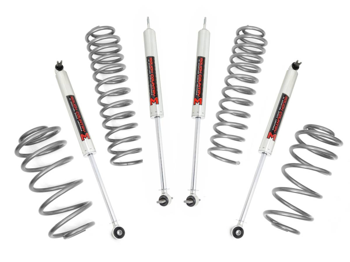 - Elevate your Jeep TJ s off-road game and style with Rough Country's 2.5" Suspension Lift Kit. Perfect for larger wheels and tires, this kit enhances your vehicle's ground clearance and gives it a rugged, attention-grabbing look on and off the trail. Lifted Front & Rear Coil Springs: Achieve a taller stance while maintaining factory-like ride quality. These coil springs are tuned to the OEM spring rate for smooth handling whether you re tackling rocky terrain or cruising highways. Customizable Shock Options: Choose from a variety of shocks, including nitrogen-charged N3 or M1 monotube shocks, to suit your driving preferences. Easy Installation: Designed for straightforward installation, this kit includes everything you need for a seamless upgrade. Built to Last: With Rough Country's Limited Lifetime Replacement Guarantee, this suspension lift kit is built to endure the toughest trails and environments. Upgrade your Jeep today and experience superior off-road capability and unmatched style with Rough Country's 2.5" Suspension Lift Kit!
