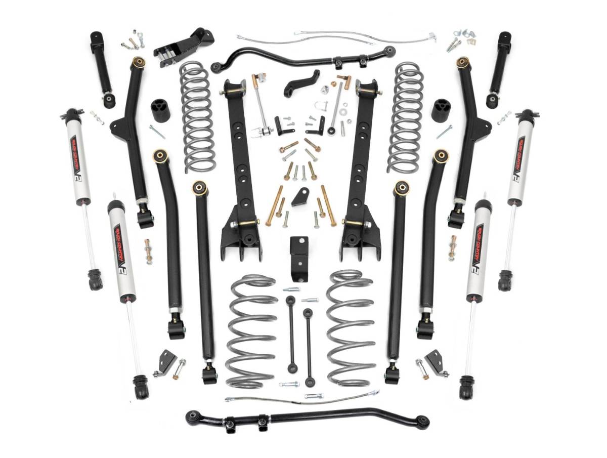 - Unlock unbeatable off-road performance with Rough Country's 6-inch Long-Arm Lift Kit, designed specifically for Jeep TJ owners and off-road enthusiasts who demand the best. Tackle any trail with confidence thanks to this ultra-durable, all-inclusive suspension system. Featuring massive adjustable lower control arms and X-Flex Joints, this beefy setup offers longer travel, high-clearance arms, and a smooth ride without sacrificing strength. Say goodbye to binding and rear-steer, and enjoy unparalleled axle flex with optimized pinion angles giving you the freedom to conquer obstacles your way. Built for the Toughest Terrain: This kit is built with heavy-duty OEM-style rubber bushings, Sway Bar Disconnects, making it the perfect upgrade for Jeep owners looking to push their rigs to the limits. Configurable with multiple shock options that we offer, this allows you to choose which shock series you want! Ranging from our nitrogen-charged N3 shocks to our M1 Monotube shocks, the power to choose is in your hands. Whether you're crawling over rocks or blazing new trails, this kit ensures your Jeep is ready for the toughest terrain. Strength Where It Counts: For off-road purists who demand the highest performance, the Rough Country 6-inch Long-Arm Lift Kit also includes upgraded front and rear Forged Adjustable Track Bars. These 16lb track bars are made from forged steel for unbeatable strength and durability far surpassing the stock equipment. Fully adjustable on the vehicle for a perfect fit, these track bars ensure stability and precision on even the most challenging trails. With Rough Country's Lifetime Replacement Warranty, you can trust this kit to take your Jeep's off-road capabilities to new heights. Get ready to dominate the trails with ease and confidence.