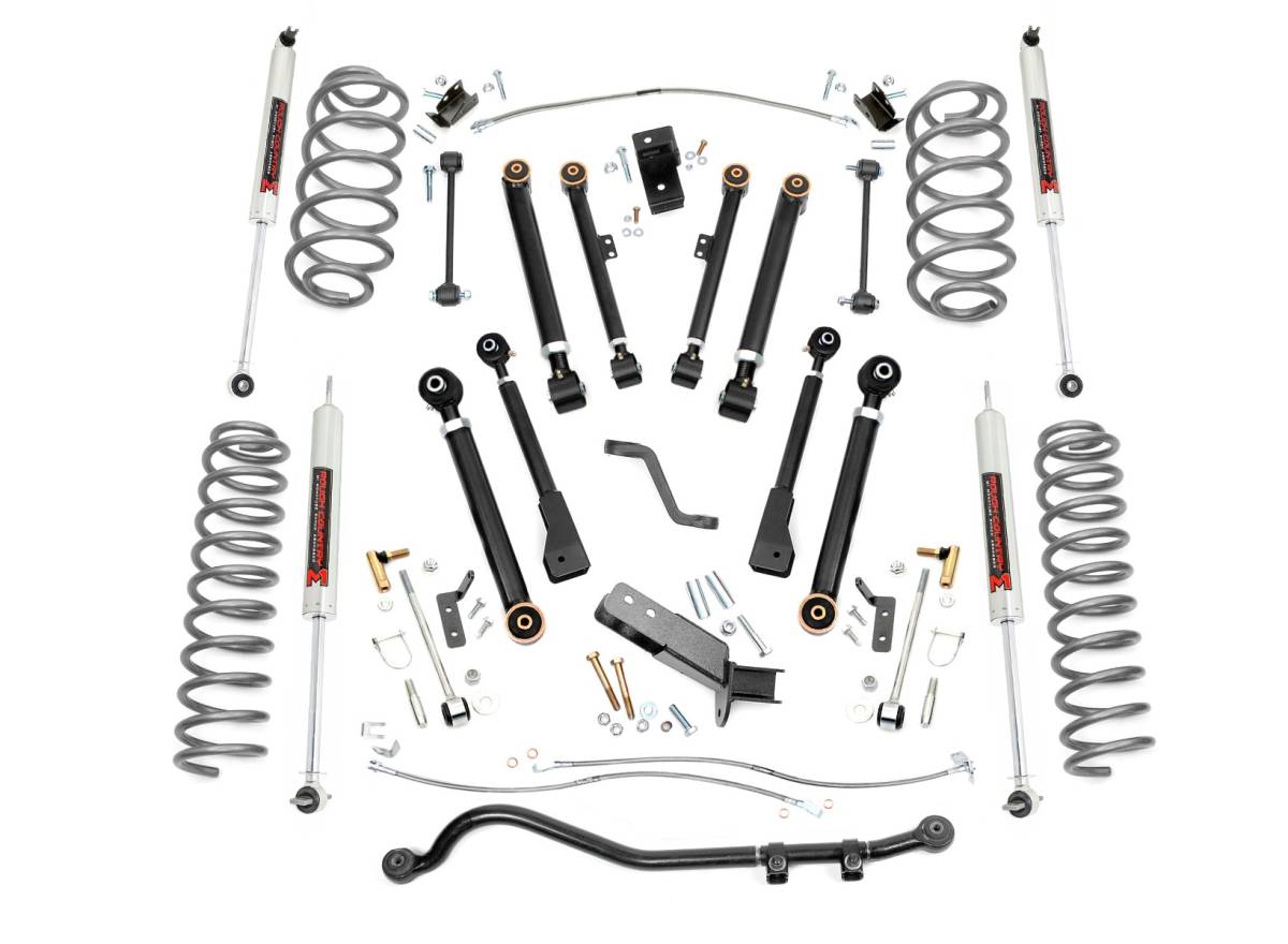 - Total Transformation, On and Off the Trail: Give your Jeep TJ the ultimate upgrade with Rough Country's 4in X-Series Suspension Lift Kit. This all-inclusive package delivers everything you need for aggressive styling, increased ground clearance, and enhanced off-road capability. Precision Adjustable Control Arms: This kit includes front and rear upper and lower X-Flex Control Arms featuring a high-clearance design. Built with OEM-style rubber bushings, fully rebuildable flex joints, and massive 2.5" diameter bodies with 1.25" threads, these control arms are fully greaseable for long-lasting durability and superior articulation. Fine-tune your ride height and suspension geometry with ease. Optimized Suspension Geometry: Lifted coil springs provide the perfect combination of ride height and vibration dampening, delivering optimal suspension performance across any terrain. This kit also includes durable stainless steel brake lines for improved reliability and safety. Heavy-Duty Forged Adjustable Track Bar: When it comes to strength and stability, the forged solid steel Adjustable Front Track Bar delivers. Weighing a robust 16 pounds, this track bar outmatches stock components, ensuring precise axle alignment and control even during extreme off-road flexing.