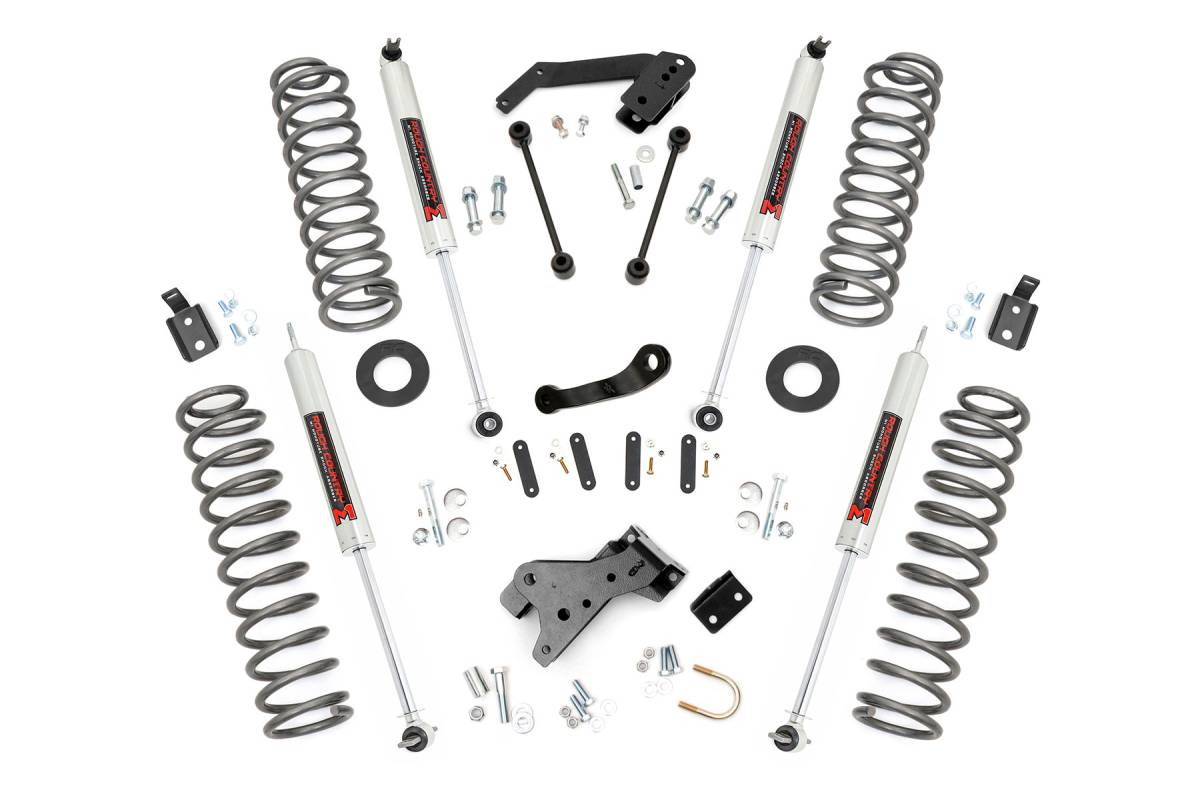 - Total transformation for your Jeep starts with Rough Country's 4-Inch Suspension Lift Kit. This all-inclusive upgrade delivers aggressive styling, enhanced ground clearance, and the rugged performance you need to conquer any trail with confidence. Engineered for Superior Suspension Geometry: Lifted coil springs pair with coil correction plates that adjust the rear coil spring angle by 10 degrees. This design improves suspension efficiency, reduces component wear, and optimizes vibration dampening across rough terrain. Custom Shock Options: Tailor your ride with nitrogen-charged N3 shocks, V2, M1 Monotube, or premium M1R shocks. Whether you want balanced on-road comfort or elite off-road control, this kit lets you fine-tune performance to your driving style. Clears Up to 35-Inch Tires: Gain the clearance to run up to 35-inch tires, giving your Jeep a commanding stance and greater off-road capability. Backed by Rough Country's Limited Lifetime Warranty: Drive with confidence knowing your investment is protected with Rough Country's limited lifetime replacement warranty.