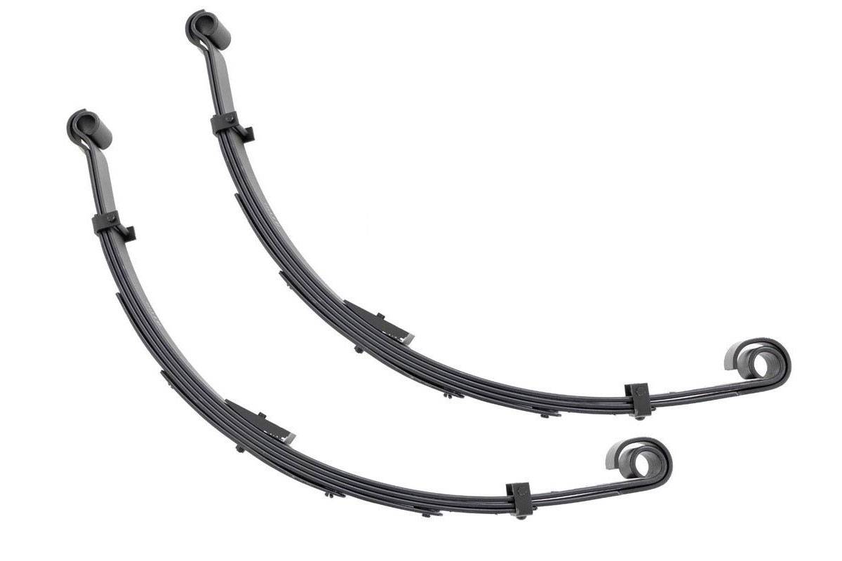 - Added Lift Height and Ride Comfort. Take your suspension kit to the next level with Rough Country's Replacement Leaf Springs. Constructed from high-quality materials and designed specifically for the weight of your vehicle. This enhanced replacement spring will provide a factory-like feel while retaining your suspension lift height. Durable and Off-Road Ready. Rough Country's Replacement Leaf Springs are designed to tackle any terrain that they are faced with. Featuring a multi-leaf design and spring pads this reduces the friction and maximizes comfort. Each leaf pack utilizes tapered leaves for improved flexibility at their ends. Installation. Rough Country's Replacement Leaf Springs offer a 100% bolt-on installation estimated to take approximately 1-2 hours depending on vehicle condition. Simply remove the pre-existing leaf spring and use the stock hardware to equip your vehicle with this high-quality replacement. Lifetime Replacement Warranty. Rough Country's Replacement Leaf is backed with a 5-year replacement warranty towards manufacturer defects. As such, the product is protected from structural and workmanship damage after the date of purchase. With our industry-leading warranty give yourself peace of mind when using Rough Country's Suspension products!