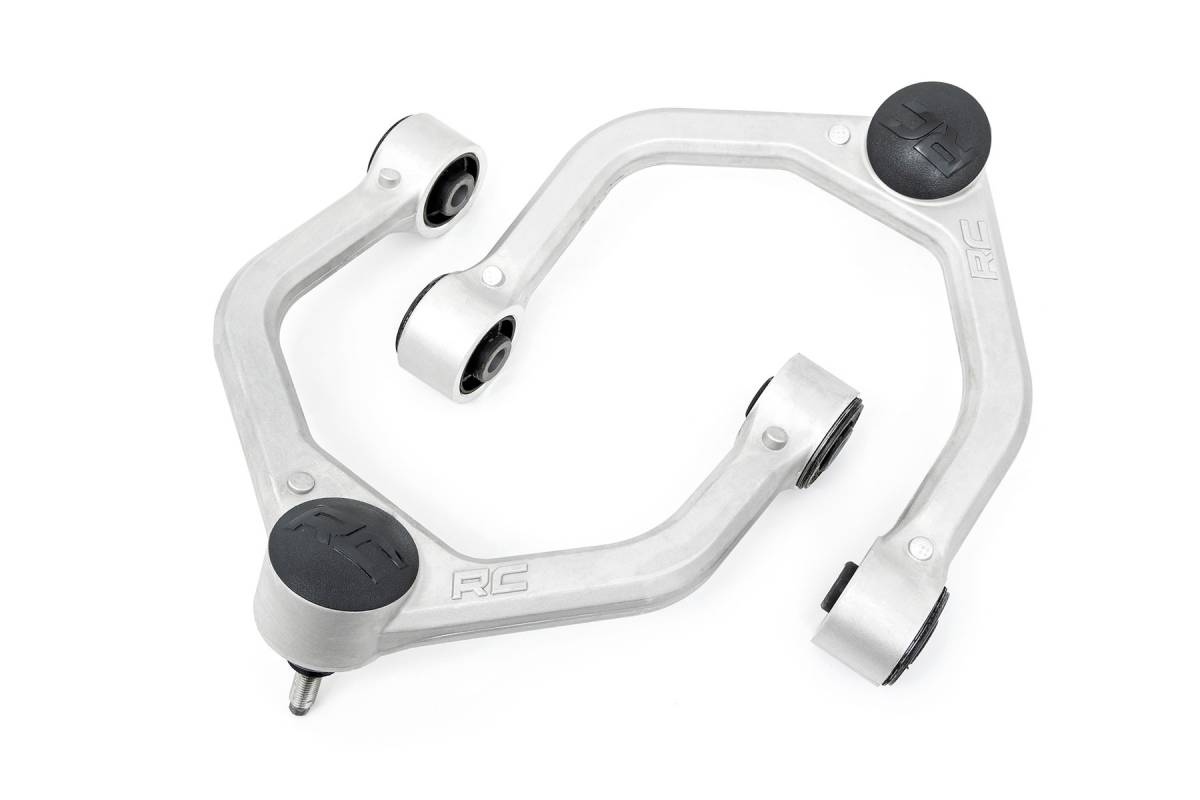 - Durable One-Piece Design. Take your truck to the next level with Rough Country's most durable Upper Control Arm to date! Rough Country's Forged Upper Control Arms feature a solid, 1-piece design made of forged aluminum for superior strength and durability. This forged design outperforms all other types of arm construction, with no welding weak spots that could bend or break. High Strength Ball Joints. Rough Country's Forged Upper Control Arms use POM ball joints which reduces metal-to-metal contact for less maintenance and longer service life versus standard or OE replacements. These Ball joints feature a POM ball race for an extremely low co-efficient of friction and an oversize ball diameter reduces load and improves range of motion in a fully greaseable design. Rough Country's Forged Upper Control Arms also feature durable rubber bushings rubber bushings for superior quality and durability. Installation. Featuring a 100% bolt-on installation process, an estimated timeframe of 3-4 hours is recommended to complete this full installation. This full kit can be installed at home and can be completed efficiently and quickly! Limited Lifetime Replacement Warranty. Rough Country's Forged Aluminum Control Arms are backed with a limited lifetime replacement warranty towards manufacturer defects. As such, the product is protected from structural and workmanship damage after the date of purchase. With our industry-leading warranty give yourself peace of mind when using Rough Country's Suspension products!
